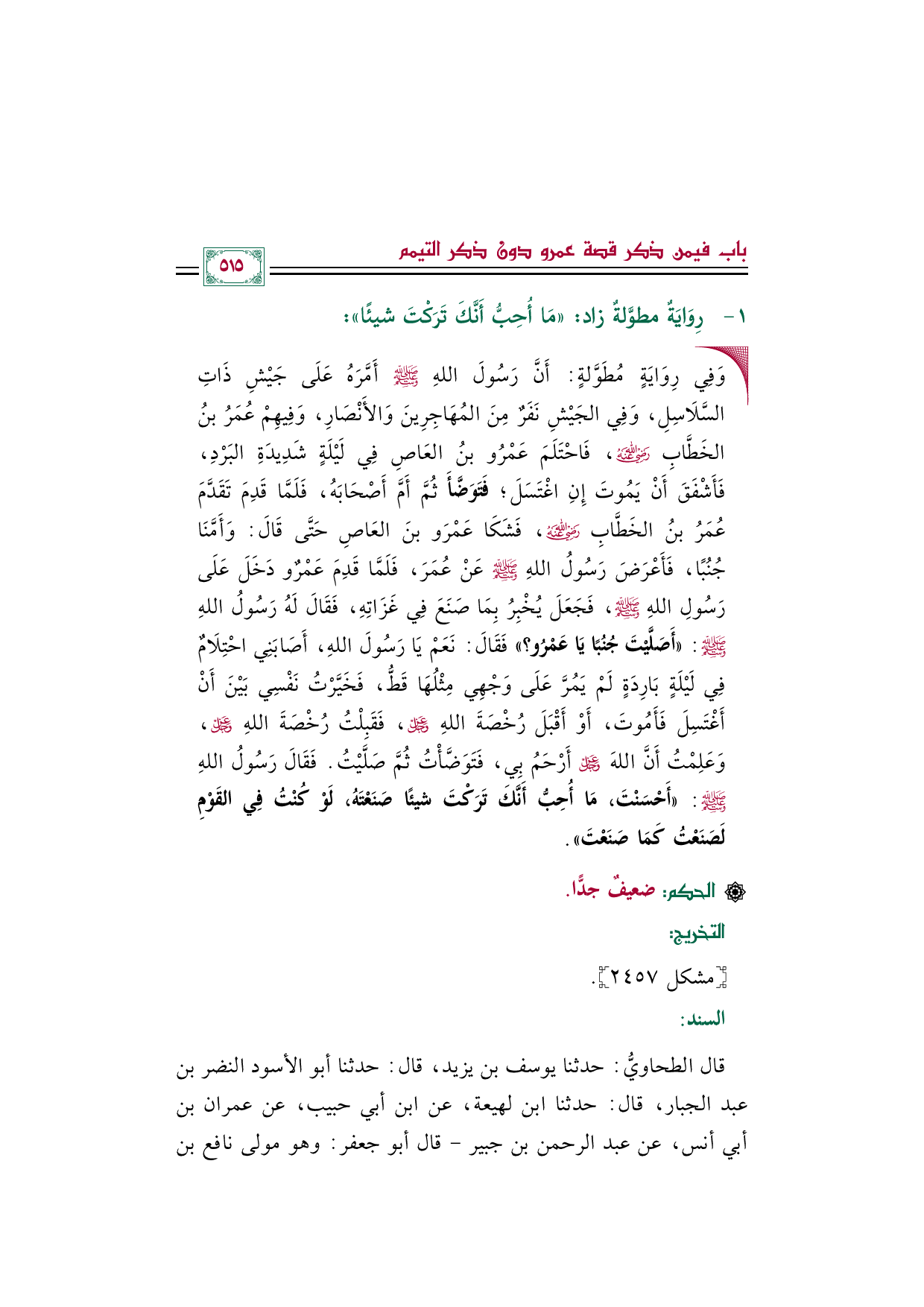 • وَفِي رِوَايَةٍ مُطَوَّلةٍ: أَنَّ رَسُولَ اللهِ صلى الله عليه وسلم أَمَّرَهُ عَلَى جَيْشِ ذَاتِ السَّلَاسِلِ، وَفِي الجَيْشِ نَفَرٌ مِنَ المُهَاجِرِينَ وَالأَنْصَارِ، وَفِيهِمْ عُمَرُ بنُ الخَطَّابِ رضي الله عنه، فَاحْتَلَمَ عَمْرُو بنُ العَاصِ فِي لَيْلَةٍ شَدِيدَةِ البَرْدِ، فَأَشْفَقَ أَنْ يَمُوتَ إِنِ اغْتَسَلَ؛ فَتَوَضَّأَ ثُمَّ أَمَّ أَصْحَابَهُ، فَلَمَّا قَدِمَ تَقَدَّمَ عُمَرُ بنُ الخَطَّابِ رضي الله عنه، فَشَكَا عَمْرَو بنَ العَاصِ حَتَّى قَالَ: وَأَمَّنَا جُنُبًا، فَأَعْرَضَ رَسُولُ اللهِ صلى الله عليه وسلم عَنْ عُمَرَ، فَلَمَّا قَدِمَ عَمْرٌو دَخَلَ عَلَى رَسُولِ اللهِ صلى الله عليه وسلم، فَجَعَلَ يُخْبِرُ بِمَا صَنَعَ فِي غَزَاتِهِ، فَقَالَ لَهُ رَسُولُ اللهِ صلى الله عليه وسلم: ((أَصَلَّيْتَ جُنُبًا يَا عَمْرُو؟)) فَقَالَ: نَعَمْ يَا رَسُولَ اللهِ، أَصَابَنِي احْتِلَامٌ فِي لَيْلَةٍ بَارِدَةٍ لَمْ يَمُرَّ عَلَى وَجْهِي مِثْلُهَا قَطُّ، فَخَيَّرْتُ نَفْسِي بَيْنَ أَنْ أَغْتَسِلَ فَأَمُوتَ، أَوْ أَقْبَلَ رُخْصَةَ اللهِ عَزَّ وَجَلَّ، فَقَبِلْتُ رُخْصَةَ اللهِ عَزَّ وَجَلَّ، وَعَلِمْتُ أَنَّ اللهَ عَزَّ وَجَلَّ أَرْحَمُ بِي، فَتَوَضَّأْتُ ثُمَّ صَلَّيْتُ. فَقَالَ رَسُولُ اللهِ صلى الله عليه وسلم: ((أَحْسَنْتَ، مَا أُحِبُّ أَنَّكَ تَرَكْتَ شيئًا صَنَعْتَهُ، لَوْ كُنْتُ فِي القَوْمِ لَصَنَعْتُ كَمَا صَنَعْتَ)).
