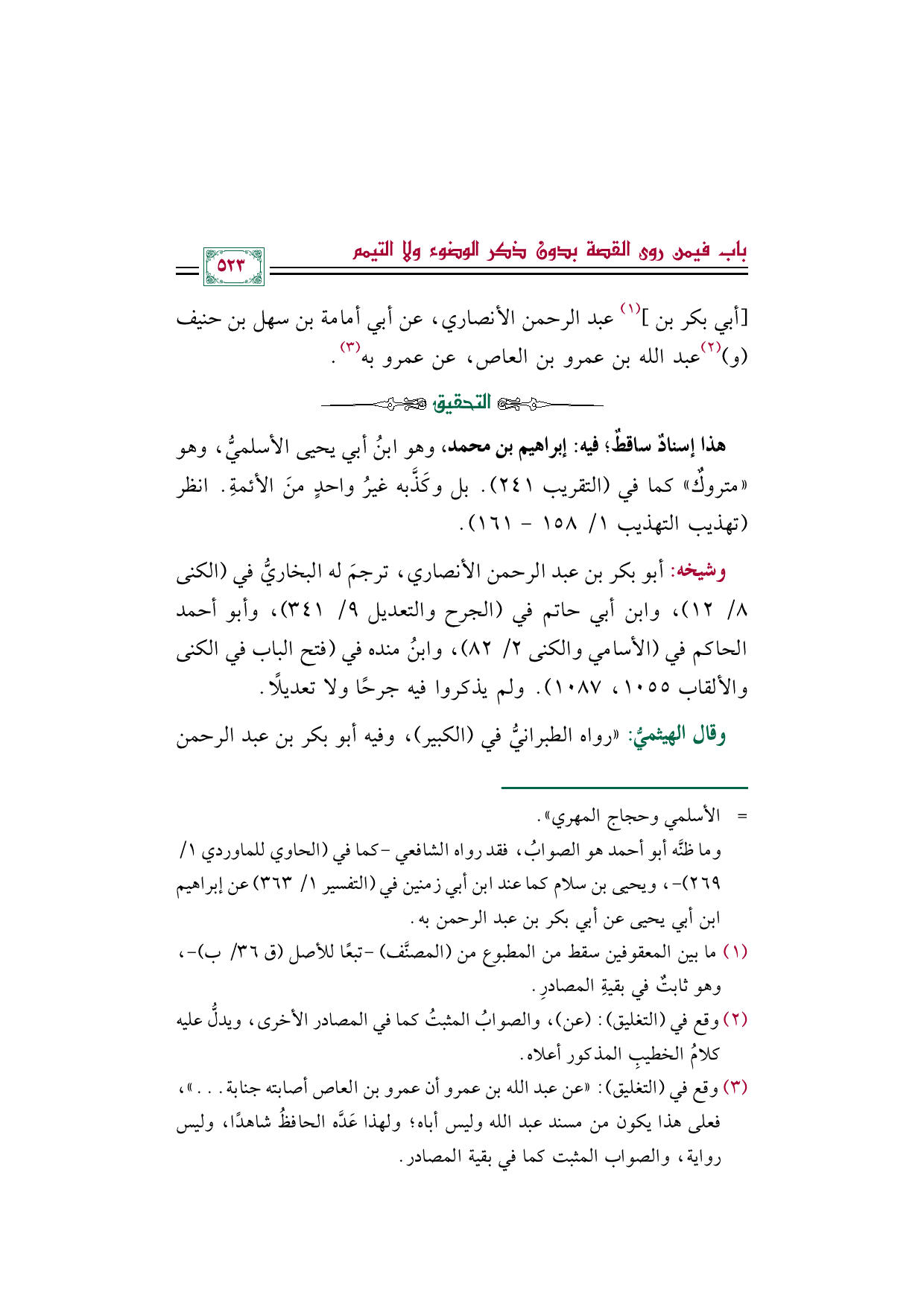 (¬٣) وقع في (التغليق): ((عن عبد الله بن عمرو أن عمرو بن العاص أصابته جنابة ... ))، فعلى هذا يكون من مسند عبد الله وليس أباه؛ ولهذا عَدَّه الحافظُ شاهدًا، وليس رواية، والصواب المثبت كما في بقية المصادر.