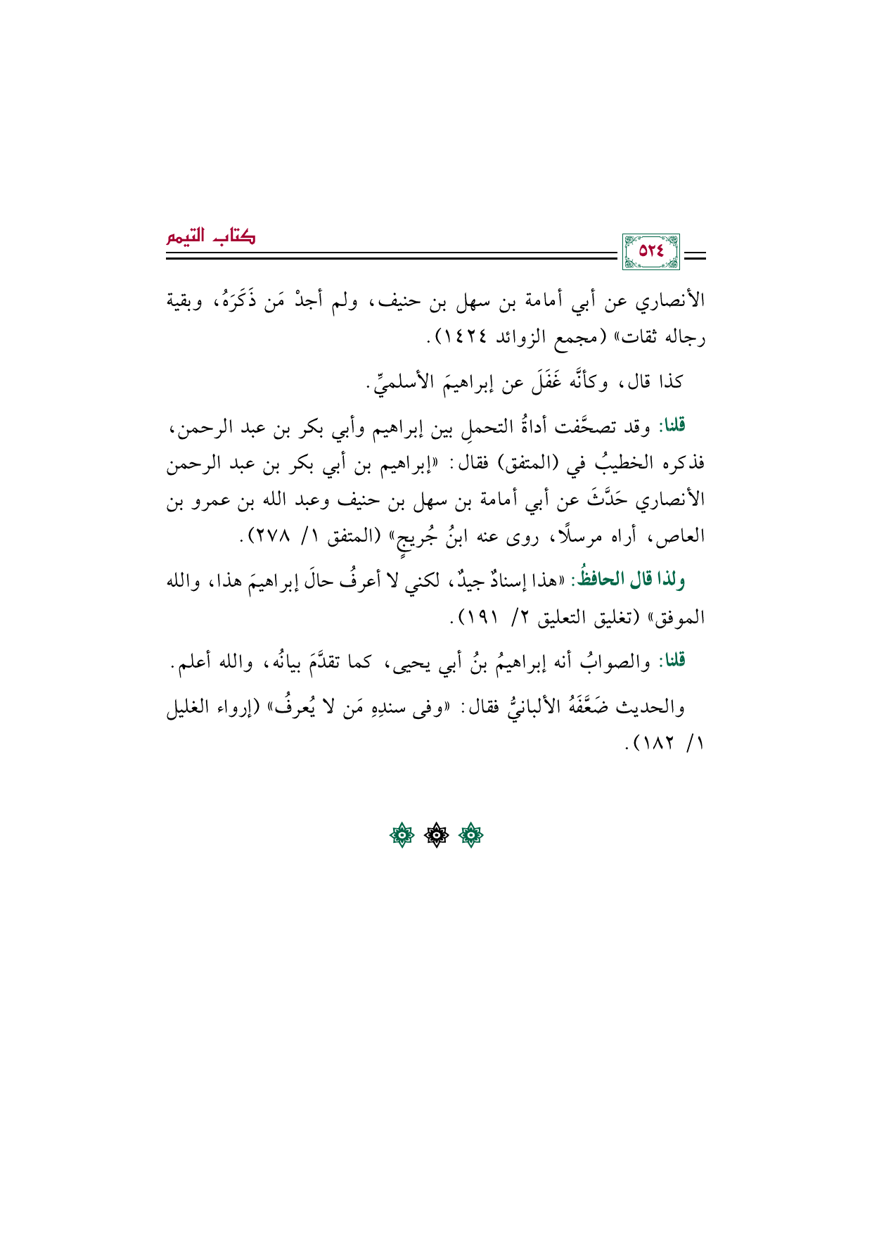 قلنا: وقد تصحَّفت أداةُ التحملِ بين إبراهيم وأبي بكر بن عبد الرحمن، فذكره الخطيبُ في (المتفق) فقال: "إبراهيم بن أبي بكر بن عبد الرحمن الأنصاري حَدَّثَ عن أبي أمامة بن سهل بن حنيف وعبد الله بن عمرو بن العاص، أراه مرسلًا، روى عنه ابنُ جُريجٍ" (المتفق ١/ ٢٧٨).