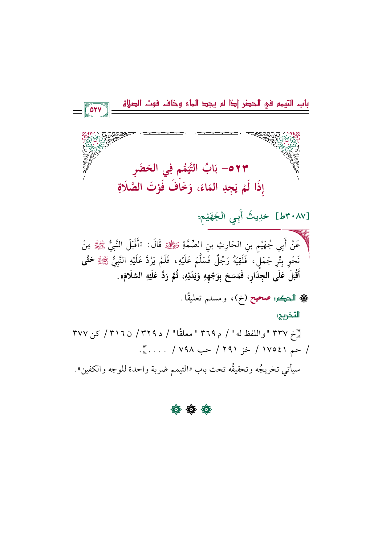 ◼ عَنْ أَبِي جُهَيْمِ بنِ الحَارِثِ بنِ الصِّمَّةِ رضي الله عنه قَالَ: ((أَقْبَلَ النَّبِيُّ صلى الله عليه وسلم مِنْ نَحْوِ بِئْرِ جَمَلٍ، فَلَقِيَهُ رَجُلٌ فَسَلَّمَ عَلَيْهِ، فَلَمْ يَرُدَّ عَلَيْهِ النَّبِيُّ صلى الله عليه وسلم حَتَّى أَقْبَلَ عَلَى الجِدَارِ، فَمَسَحَ بِوَجْهِهِ وَيَدَيْهِ، ثُمَّ رَدَّ عَلَيْهِ السَّلَامَ)).