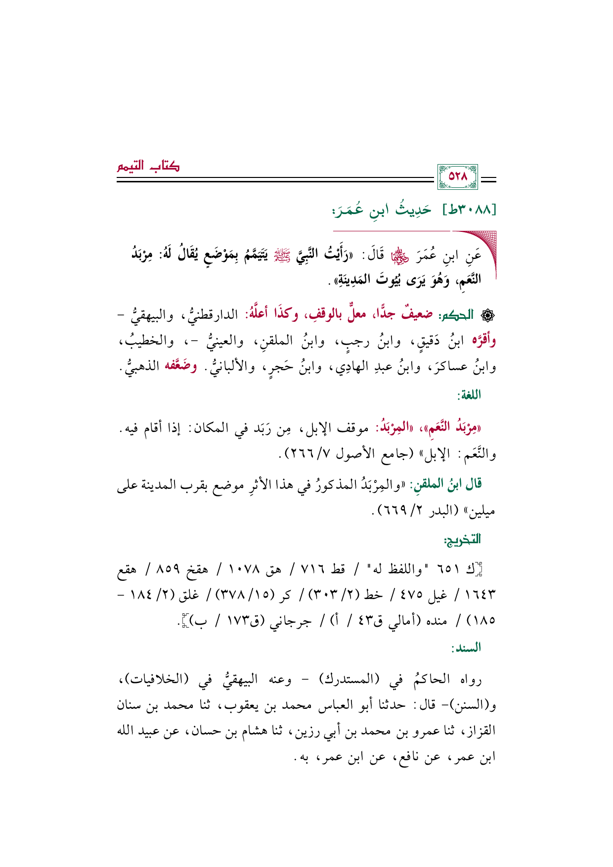 قال ابنُ الملقنِ: "والمِرْبَدُ المذكورُ في هذا الأثرِ موضع بقرب المدينة على ميلين" (البدر ٢/ ٦٦٩).