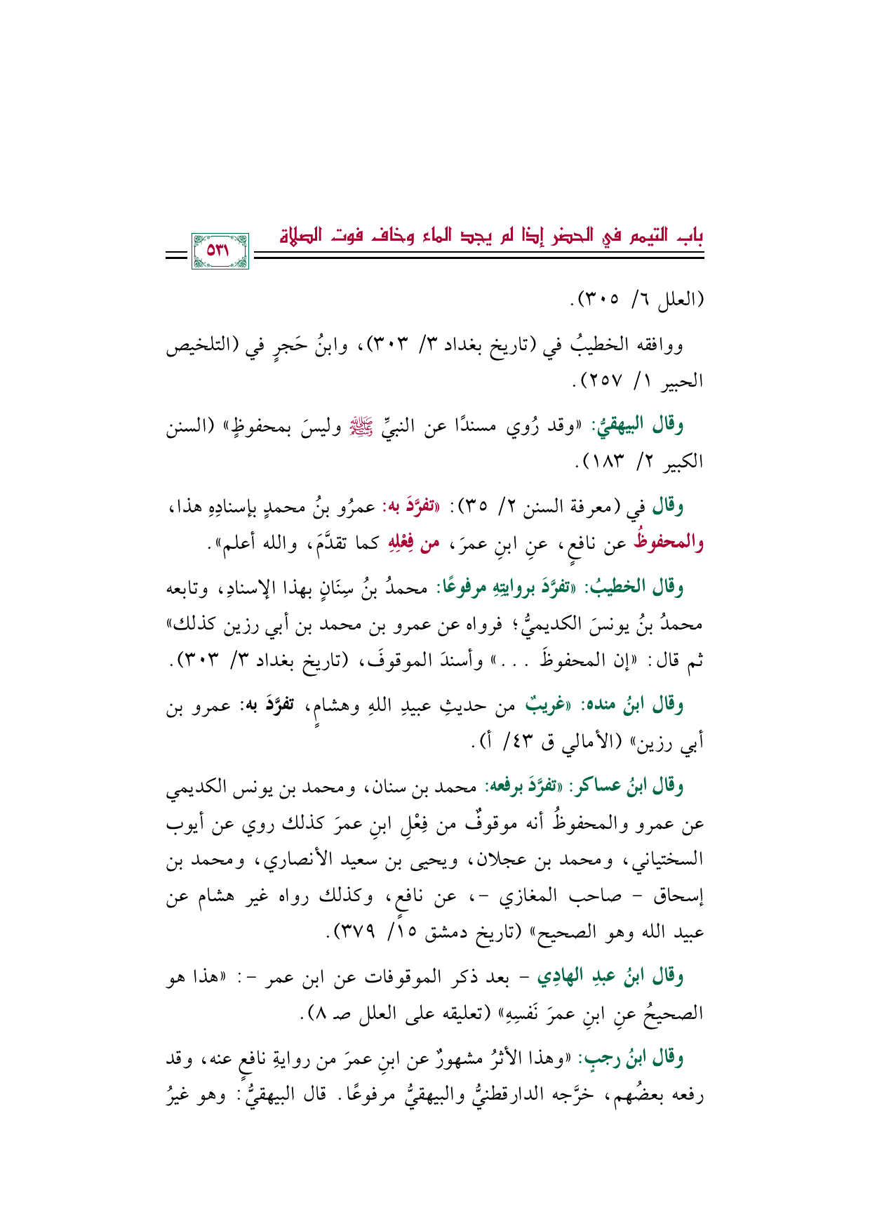 وقال في (معرفة السنن ٢/ ٣٥): "تفرَّدَ به: عمرُو بنُ محمدٍ بإسنادِهِ هذا، والمحفوظُ عن نافعٍ، عنِ ابنِ عمرَ، من فِعْلِهِ كما تقدَّمَ، والله أعلم".