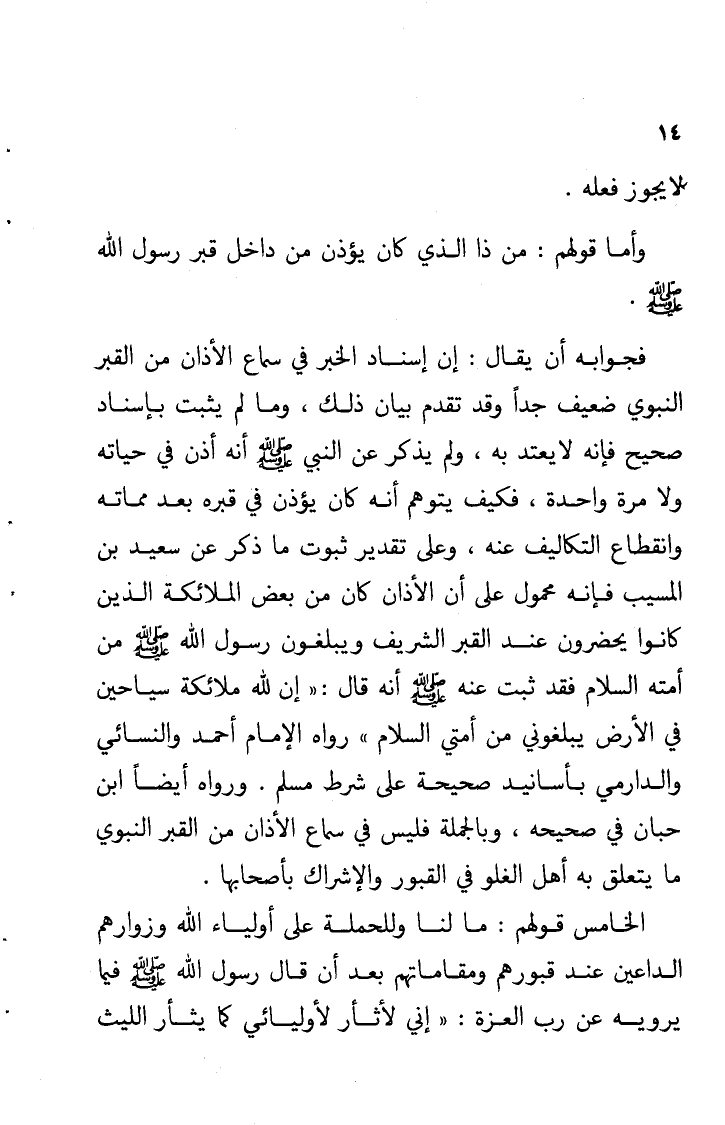 فجوابه أن يقال: إن إسناد الخبر في سماع الأذان من القبر النبوي ضعيف جداً وقد تقدم بيان ذلك، وما لم يثبت بإسناد صحيح فإنه لا يعتد به، ولم يذكر عن النبي - صلى الله عليه وسلم - أنه أذن في حياته ولا مرة واحدة، فكيف يتوهم أنه كان يؤذن في قبره بعد مماته وانقطاع التكاليف عنه، على تقدير ثبوت ما ذكر عن سعيد بن المسيب فإنه محمول على أن الأذان كان من بعض الملائكة الذين كانوا يحضرون عند القبر الشريف ويبلغون رسول الله - صلى الله عليه وسلم - من أمته السلام فقد ثبت عنه - صلى الله عليه وسلم - أنه قال: «إن لله ملائكة سياحين في الأرض يبلغوني من أمتي السلام» رواه الإمام أحمد والنسائي والدرامي بأسانيد صحيحة على شرط مسلم. ورواه أيضا ابن حبان في صحيحه، وبالجملة فليس في سماع الأذان من القبر النبوي ما يتعلق به أهل الغلو في القبور والإشراك بأصحابها.