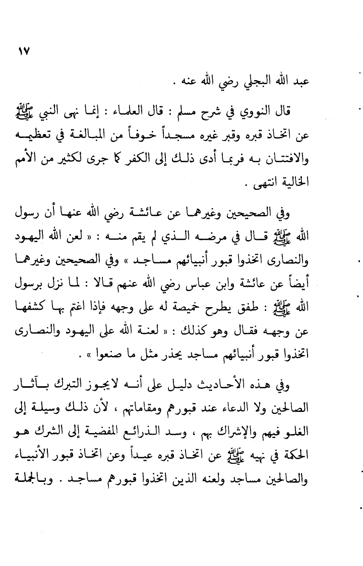 وفي هذه الأحاديث دليل على أنه لا يجوز التبرك بآثار الصالحين ولا الدعاء عند قبورهم ومقاماتهم، لأن ذلك وسيلة إلى الغلو فيهم والإشراك بهم، وسد الذرائع المفضية إلى الشرك هو الحكمة في نهيه - صلى الله عليه وسلم - عن اتخاذ قبره عيداً وعن اتخاذ قبور الأنبياء والصالحين مساجد ولعنه الذين اتخذوا قبورهم مساجد. وبالجملة