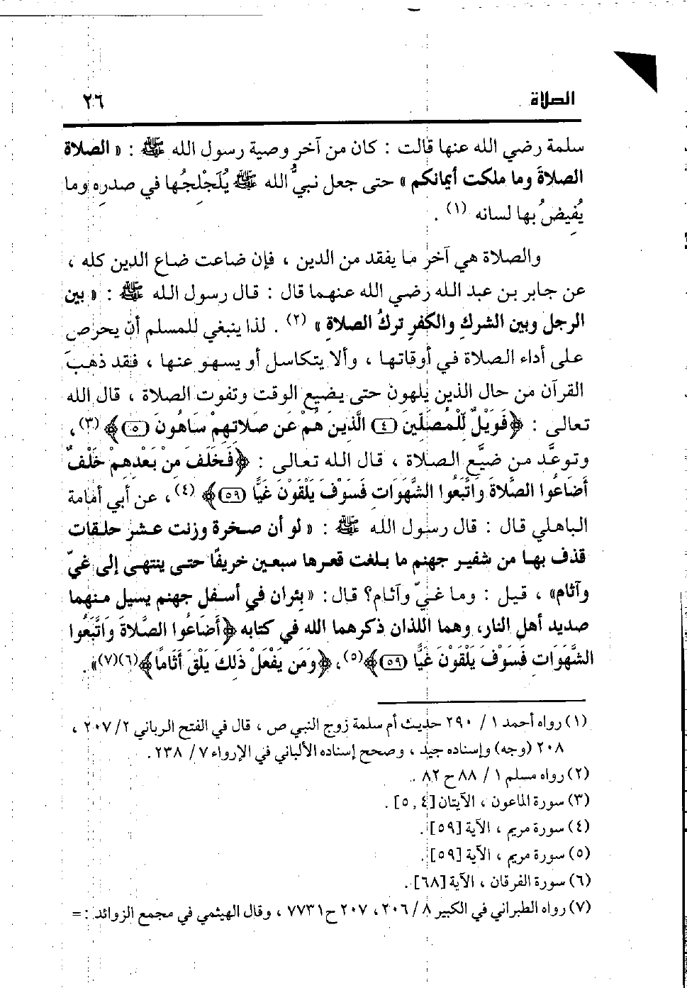 والصلاة هي آخر ما يفقد من الدين، فإن ضاعت ضاع الدين كله، عن جابر بن عبد الله رضي الله عنهما قال: قال رسول الله صلى الله عليه وسلم: "بين الرجل وبين الكفر ترك الصلاة" 2.لذا ينبغ للمسلم أن يحرص على أداء الصلاة في أوقاتها، وألا يتكاسل عنها، فقد ذهب القرآن من حال الذين يلهون حتى يضيع الوقت وتفوت الصلاة، قال الله تعالى: {فَوَيْلٌ لِلْمُصَلِّينَ الَّذِينَ هُمْ عَنْ صَلاتِهِمْ سَاهُونَ} 3، وتوعد من ضيع الصلاة، قال الله تعالى: {فَخَلَفَ مِنْ بَعْدِهِمْ خَلْفٌ أَضَاعُوا الصَّلاةَ وَاتَّبَعُوا الشَّهَوَاتِ فَسَوْفَ يَلْقَوْنَ غَيّاً} 4، عن أبي أمامة الباهلي قال: قال رسول الله صلى الله عليه وسلم: "لو أن صخرة وزنت عشر حلقات قذف بها من شفير جهنم ما بلغت قعرها سبعين خريفا حتى ينتهي إلى غي وآثام؟ " قال: "بئران في أسفل جهنم يسيل منهما صديد أهل النار، وهما اللذان ذكرهما الله في كتابه {أَضَاعُوا الصَّلاةَ وَاتَّبَعُوا الشَّهَوَاتِ فَسَوْفَ يَلْقَوْنَ غَيّاً} 5، {وَمَنْ يَفْعَلْ ذَلِكَ يَلْقَ أَثَاماً} 6"7