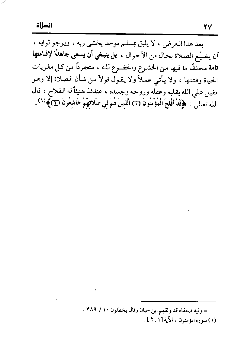 بعد هذا العرض، لا يليق بمسلم يخشى ربه، ويرجو ثوابه، أن يضيع الصلاة بحال من الأحوال، بل ينبغي أن يسعى جاهدا لإقامتها تامة محققا ما فيها من الخضوع والخشوع لله، متجردا من كل مغريات الحياة وفتنها، ولا يأتي عملا ولا يقول قولا من شأن الصلاة إلا وهو مقبل على الله بقلبه وعقله وروحه وجسده، عندئذ هنيئا له الفلاح، قال الله تعالى: {قَدْ أَفْلَحَ الْمُؤْمِنُونَ الَّذِينَ هُمْ فِي صَلاتِهِمْ خَاشِعُونَ} 1.