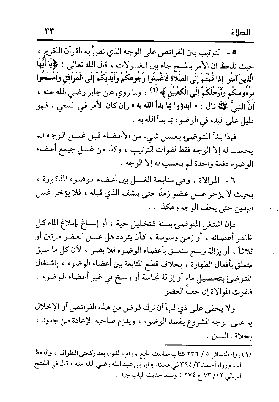 5- الترتيب بين الفرائض على الوجه الذي نص به القرآن الكريم حيث نلحظ أن الأمر بالمسح جاء بين المغسولات، قال الله تعالى: {يَا أَيُّهَا الَّذِينَ آمَنُوا إِذَا قُمْتُمْ إِلَى الصَّلاةِ فَاغْسِلُوا وُجُوهَكُمْ وَأَيْدِيَكُمْ إِلَى الْمَرَافِقِ وَامْسَحُوا بِرُؤُوسِكُمْ وَأَرْجُلَكُمْ إِلَى الْكَعْبَيْنِ} 1، ولما روي عن جابر رضي الله عنه، أن النبي صلى الله عليه وسلم قال: "ابدؤوا بما بدأ الله به" وإن كان الأمر في السعي، فهو دليل على البدء في الوضوء بما بدأ الله به.