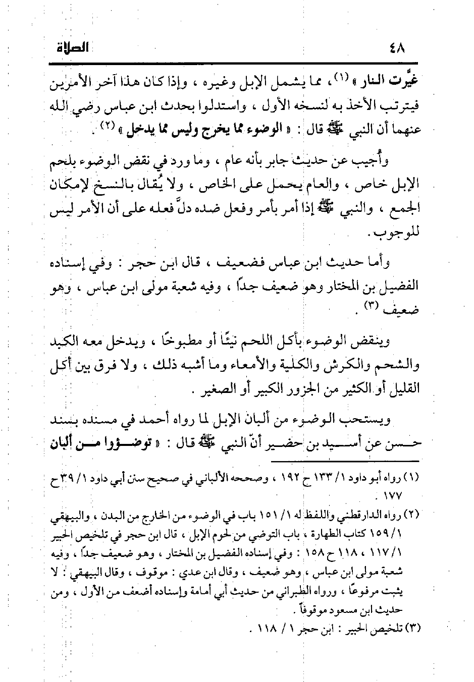 2 رواه الدارقطني واللفظ له 1/151 باب في الوضوء من الخارج من البدن والبيهقي 1/159 كتاب الطهارة، باب التوضي من لحوم الإبل، قال ابن حجر في تلخيص الحبير 1/117، 118 ح158: وفي إسناده الفضيل بن المختار وهو ضعيف جدا، وفيه شعبة مولى ابن عباس وهو ضعيف، وقال ابن عدي: موقوف، وقال البيهقي: لا يثبت مرفوعا، ورواه الطبراني من حديث أبي أمامة وإسناده أضعف من الأول، ومن حديث ابن مسعود موقوفا.