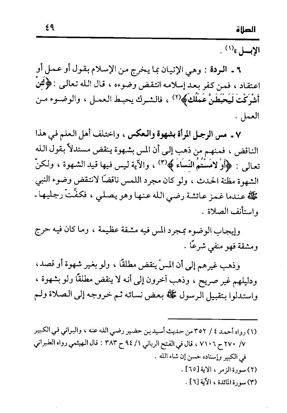 6- الردة: وهي الإتيان بما يخرج من الإسلام بقول أوعمل أو اعتقاد، فمن كفر بعد إسلامه انتقض وضوءه، قال الله تعالى: {لَئِنْ أَشْرَكْتَ لَيَحْبَطَنَّ عَمَلُكَ} 2، فالشرك يحبط العمل، والوضوء من العمل.