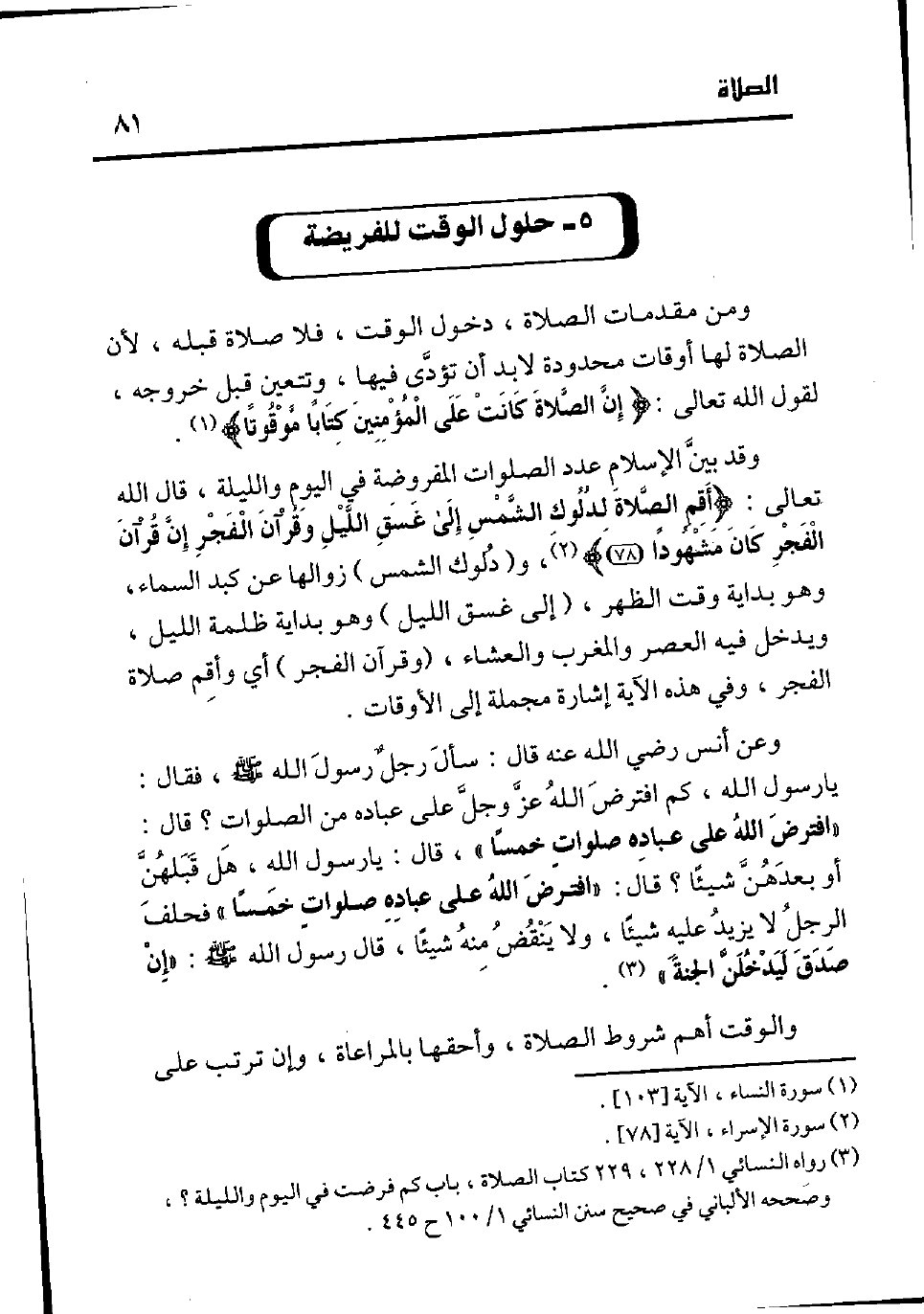 كتاب الصلاة وصف مفصل للصلاة بمقدماتها مقرونة بالدليل من الكتاب والسنة، وبيان لأحكامها وآدابها وشروطها وسننها من التكبير حتى التسليم