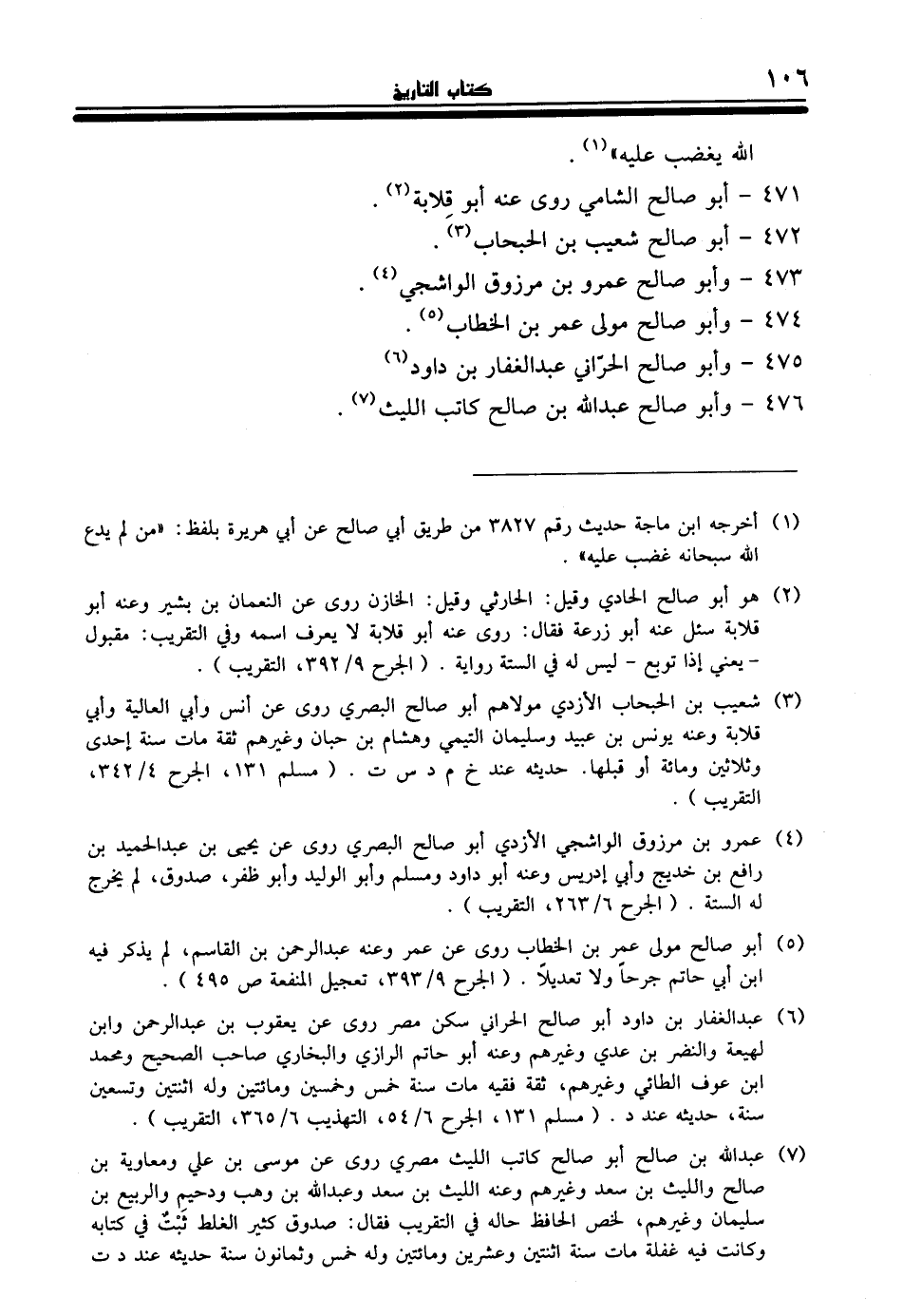 (¬5) أبو صالح مولى عمر بن الخطاب روى عن عمر وعنه عبد الرحمن بن القاسم، لم يذكر فيه ابن أبي حاتم جرحًا ولا تعديلًا. (الجرح 9/ 393، تعجيل المنفعة ص 495).