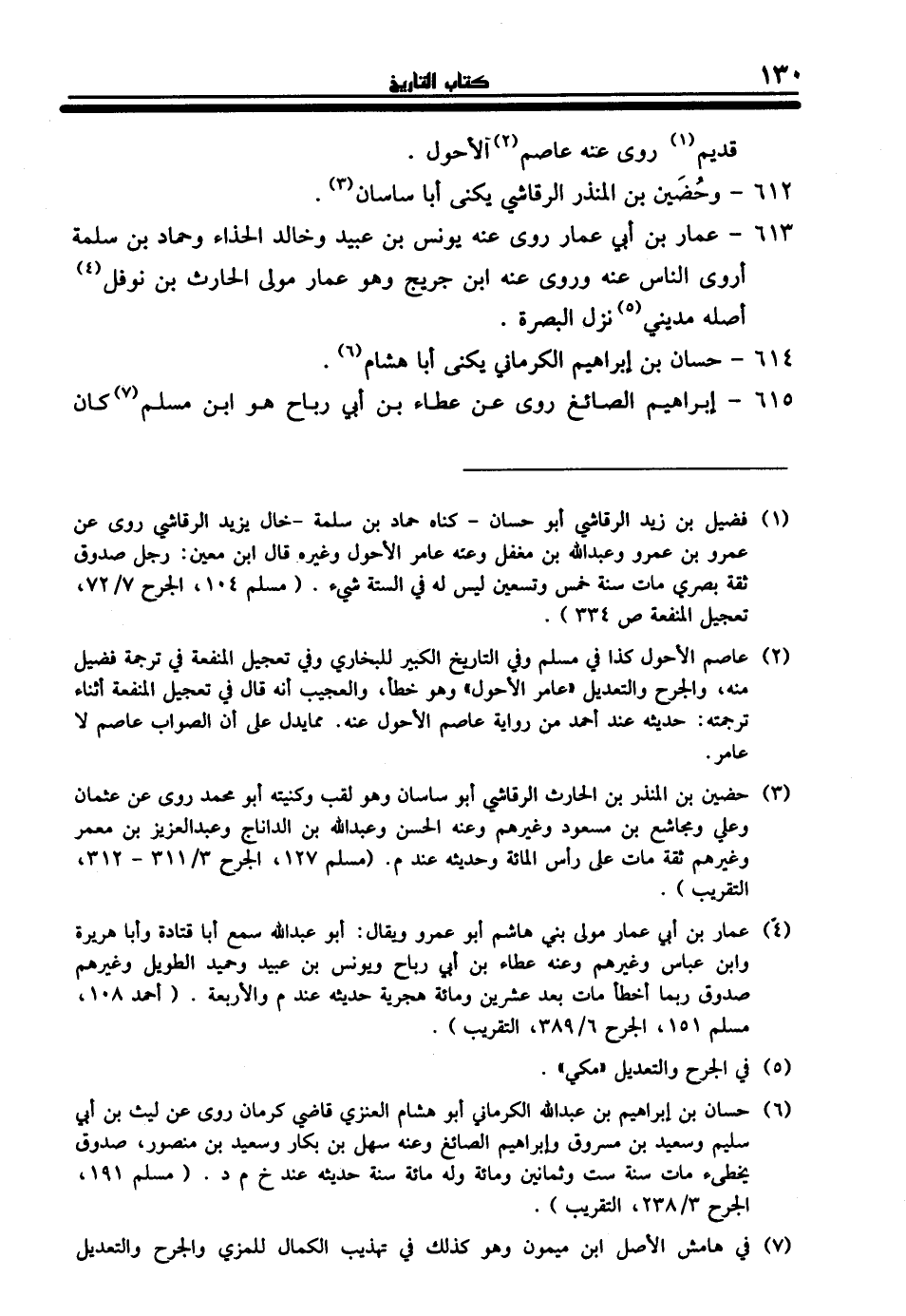 (¬2) عاصم الأحول كذا في مسلم وفي التاريخ الكبير للبخاري وفي تعجيل المنفعة في ترجمة فضيل منه، والجرح والتعديل "عامر الأحول" وهو خطأ، والعجيب أنه قال في تعجيل المنفعة أثناء ترجمته: حديثه عند أحمد من رواية عاصم الأحول عنه. مما يدل على أن الصواب عاصم لا عامر.