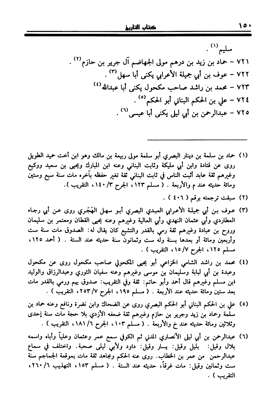 (¬1) حماد بن سلمة بن دينار البصري أبو سلمة مولى ربيعة بن مالك وهو ابن أخت حميد الطويل روى عن قتادة وابن أبي مليكة وثابت البناني وعنه ابن المبارك ويحيى بن سعيد ووكيع وغيرهم ثقة عابد أثبت الناس في ثابت البناني ثقة تغير حفظه بآخره مات سنة سبع وستين ومائة حديثه عند م والأربعة. (مسلم 123، الجرح 3/ 140، التقريب).