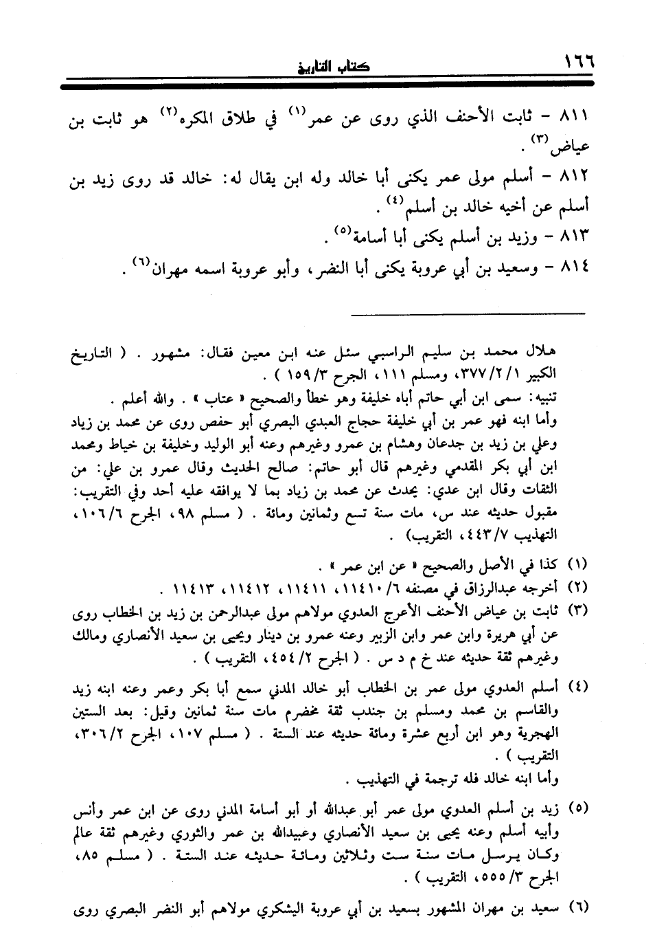 (¬5) زيد بن أسلم العدوي مولى عمر أبو عبد الله أو أبو أسامة المدني روى عن ابن عمر وأنس وأبيه أسلم وعنه يحيى بن سعيد الأنصاري وعبيد الله بن عمر والثورى وغيرهم ثقة عالم وكان يرسل مات سنة ست وثلاثين ومائة حديثه عند الستة. (مسلم 85، الجرح 3/ 555، التقريب).