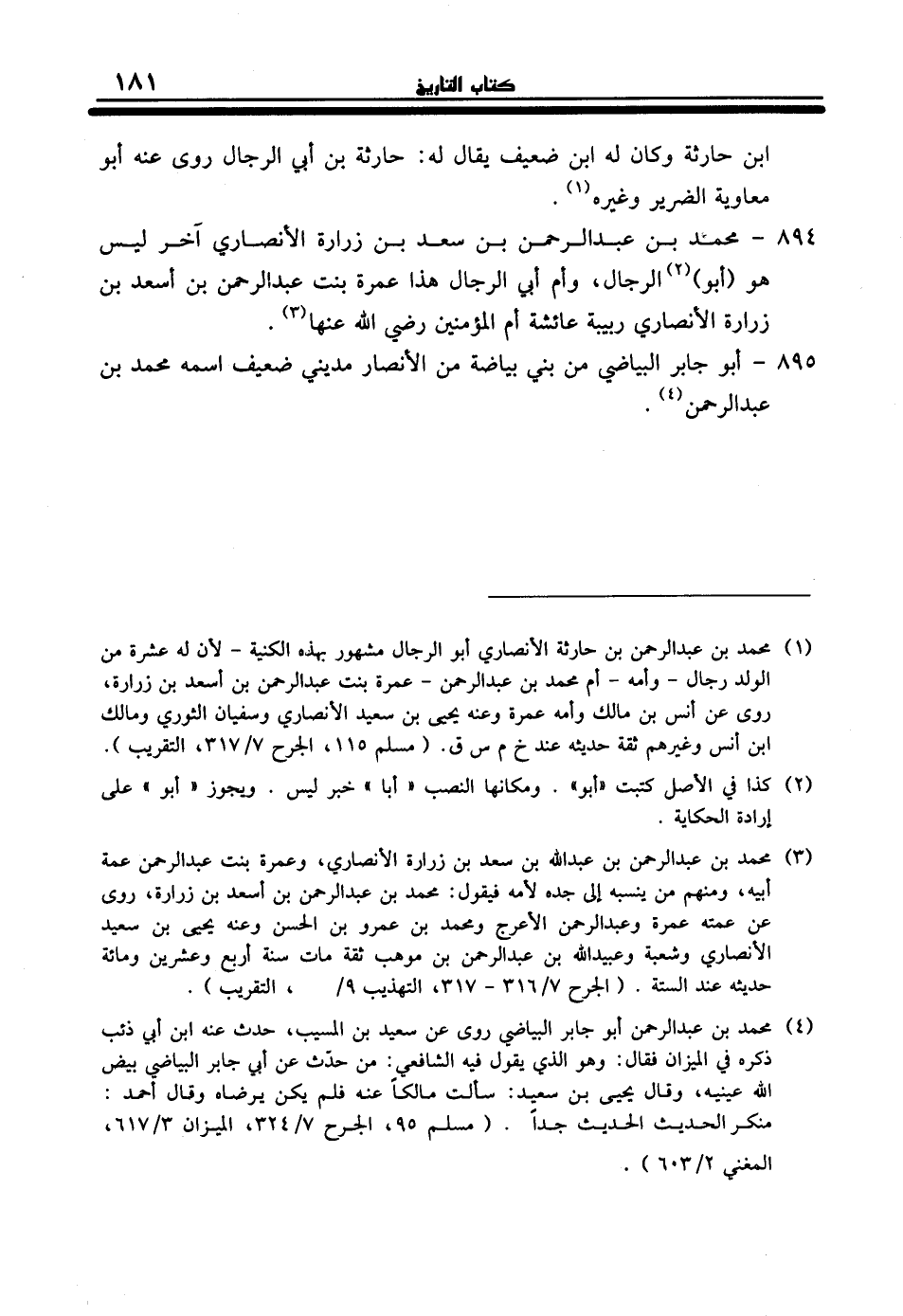 894 - محمد بن عبد الرحمن بن سعد بن زرارة الأنصاري آخر ليس هو (أبو) (¬2) الرجال، وأم أبي الرجال هذا عمرة بنت عبد الرحمن بن أسعد بن زرارة الأنصاري ربيبة عائشة أم المؤمنين رضي الله عنها (¬3).
