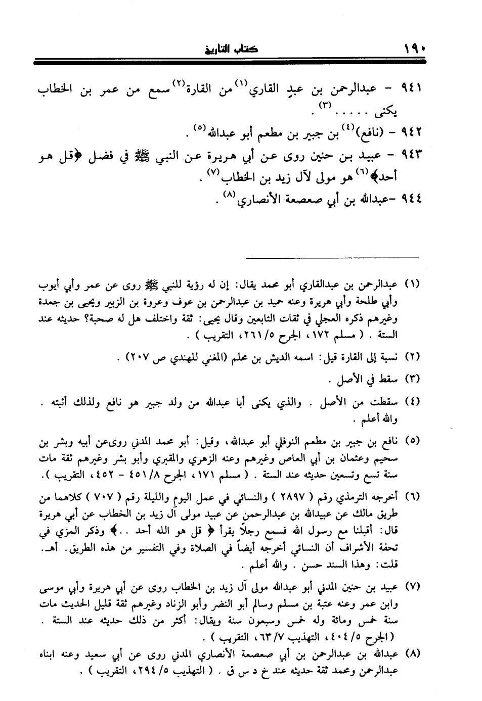 941 - عبد الرحمن بن عبدٍ القاري (¬1) من القارة (¬2) سمع من عمر بن الخطاب يكنى. . . . . (¬3).