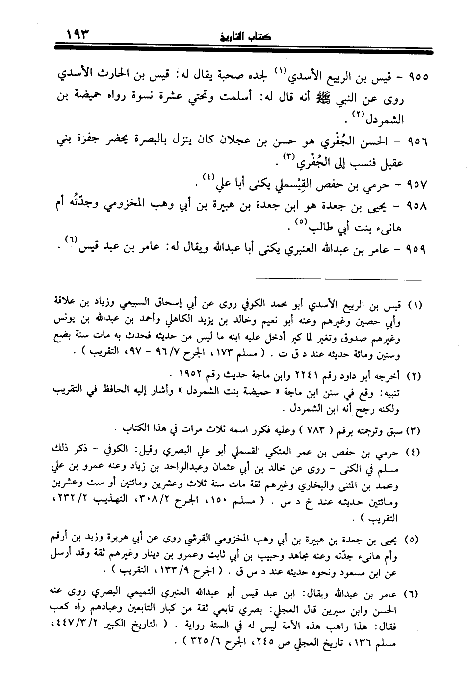 (¬6) عامر بن عبد الله ويقال: ابن عبد قيس أبو عبد الله العنبري التميمي البصري روى عنه الحسن وابن سيرين قال العجلي: بصري تابعي ثقة من كبار التابعين وعبادهم رآه كعب فقال: هذا راهب هذه الأمة ليس له في الستة رواية. (التاريخ الكبير 2/ 3/ 447، مسلم 136، تاريخ العجلي ص 245، الجرح 6/ 325).