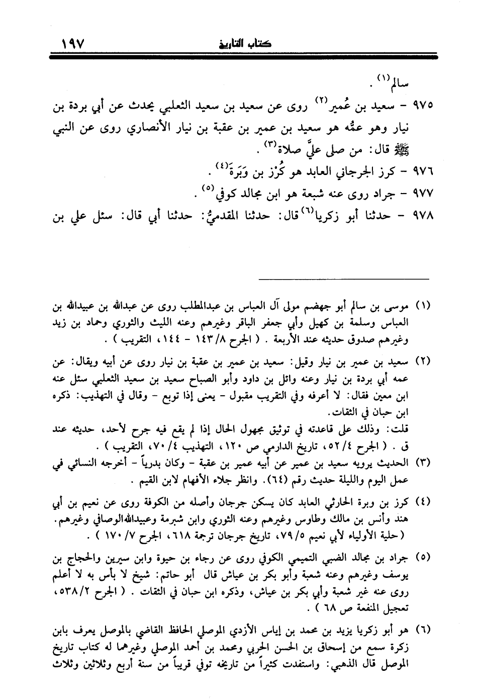 (¬6) هو أبو زكريا يزيد بن محمد بن إياس الأزدي الموصلي الحافظ القاضي بالموصل يعرف بابن زكرة سمع من إسحاق بن الحسن الحربي ومحمد بن أحمد الموصلي وغيرهما له كتاب تاريخ المرسل قال الذهبي: واستفدت كثيرًا من تاريخه توفي قريبًا من سنة أربع وثلاثين وثلاث