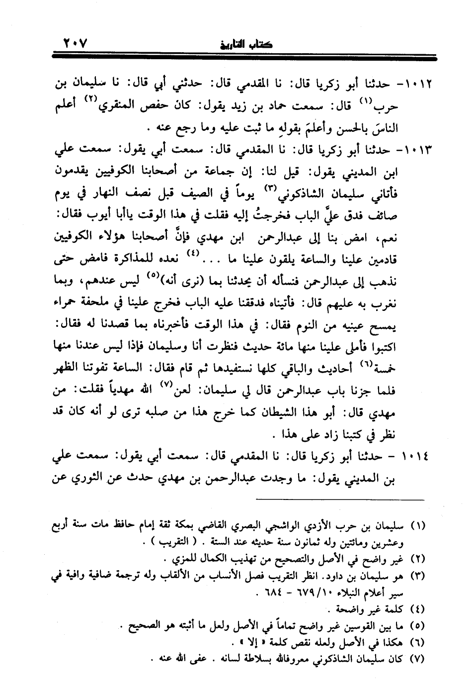 1013 - حدثنا أبو زكريا قال: نا المقدمي قال: سمعت أبي يقول: سمعت علي بن المديني يقول: قيل لنا: إن جماعة من أصحابنا الكوفيين يقدمون فأتاني سليمان الشاذكوني (¬3) يومًا في الصيف قبل نصف النهار في يوم صائف فدق عليَّ الباب فخرجتُ إليه فقلت في هذا الوقت يا أبا أيوب فقال: نعم، امض بنا إلى عبد الرحمن ابن مهدي فإنَّ أصحابنا هؤلاء الكوفيين قادمين علينا والساعة يلقون علينا ما. . . (¬4) نعده للمذاكرة فامض حتى نذهب إلى عبد الرحمن فنسأله أن يحدثنا بما (نرى أنه) (¬5) ليس عندهم، وبما نغرب به عليهم قال: فأتيناه فدققنا عليه الباب فخرج علينا في ملحفة حمراء يمسح عينيه من النوم فقال: في هذا الوقت فأخبرناه بما قصدنا له فقال: اكتبوا فأملى علينا منها مائة حديث فنظرت أنا وسليمان فإذا ليس عندنا منها خمسة (¬6) أحاديث والباقي كلها نستفيدها ثم قام فقال: الساعة تفوتنا الظهر فلما جزنا باب عبد الرحمن قال لي سليمان: لعن (¬7) الله مهديًا فقلت: من مهدي قال: أبو هذا الشيطان كما خرج هذا من صلبه ترى لو أنه كان قد نظر في كتبنا زاد على هذا.