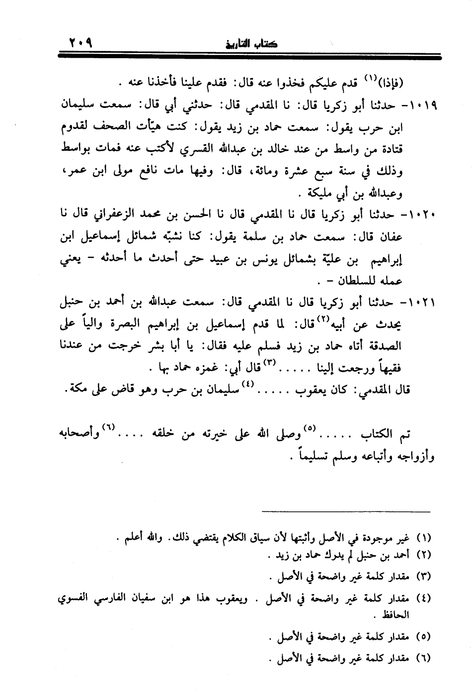 1021 - حدثنا أبو زكريا قال نا المقدمي قال: سمعت عبد الله بن أحمد بن حنبل يحدث عن أبيه (¬2) قال: لما قدم إسماعيل بن إبراهيم البصرة واليًا على الصدقة أتاه حماد بن زيد فسلم عليه فقال: يا أبا بشر خرجت من عندنا فقيهًا ورجعت إلينا. . . . (¬3) قال أبي: غمزه حماد بها.