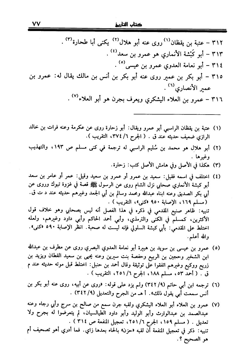 312 - عتبة بن يقظان (¬1) روى عنه أبو هلال (¬2) يكنى أبا طحارة (¬3).