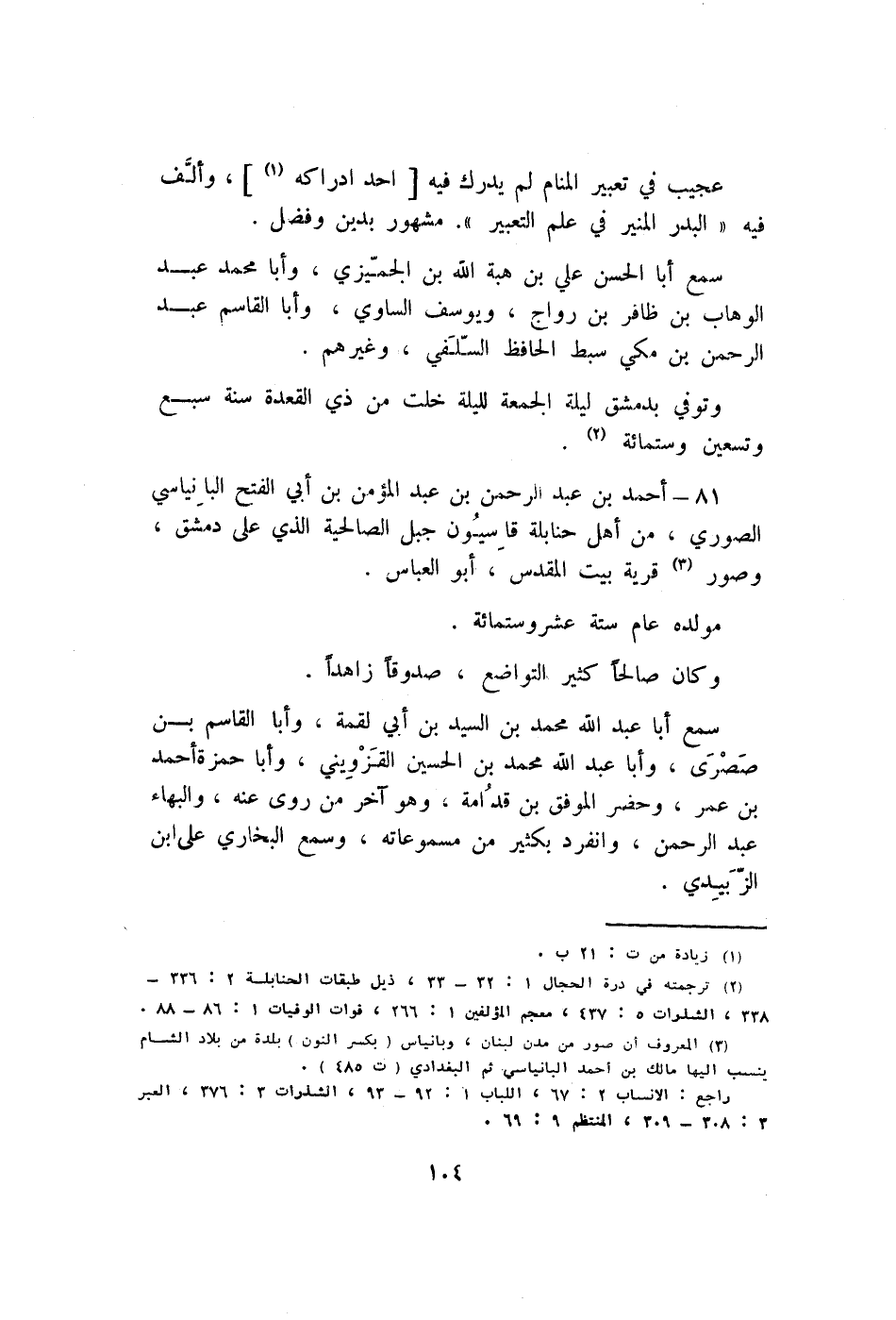 81 - أَحْمد بن عبد الرَّحْمَن بن عبد الْمُؤمن بن ابي الْفَتْح البانياسي الصُّورِي من أهل حنابلة قاسيون جبل الصالحية الَّذِي على دمشق وصور قَرْيَة بَيت الْمُقَدّس أَبُو الْعَبَّاس