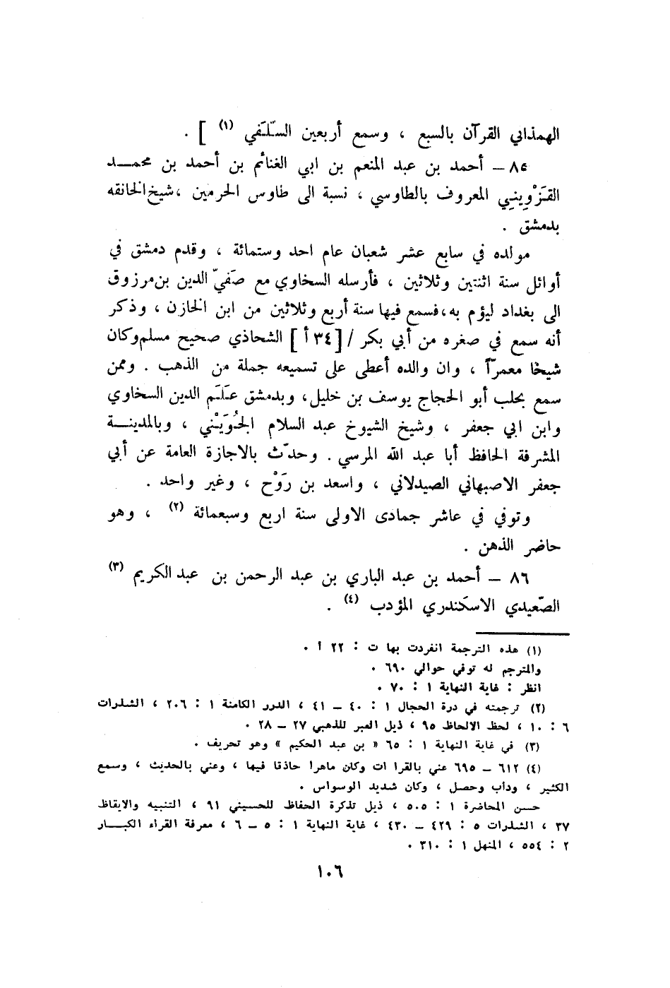 85 - أَحْمد بن عبد الْمُنعم بن ابي الْغَنَائِم بن أَحْمد بن مُحَمَّد الْقزْوِينِي الْمَعْرُوف بالطاوسي نِسْبَة إِلَى طَاوس الْحَرَمَيْنِ شيخ الخانقة بِدِمَشْق