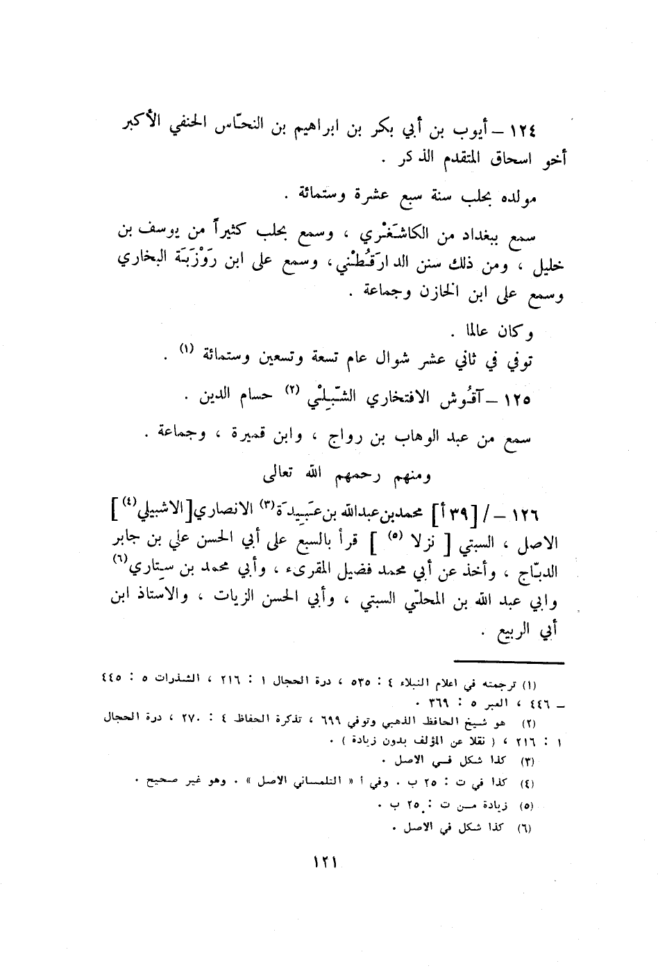 126 - مُحَمَّد بن عبد الله بن عُبَيْدَة الْأنْصَارِيّ الاشبيلي الأَصْل السبتي نزلا قَرَأَ بالسبع على ابي الْحسن عَليّ بن جَابر الدباج وَأخذ عَن ابي مُحَمَّد فُضَيْل الْمُقْرِئ وابي مُحَمَّد بن ستاري وابي عبد الله بن الْمحلي السبتي وابي الْحسن الزيات والاستاذ ابْن ابي الرّبيع