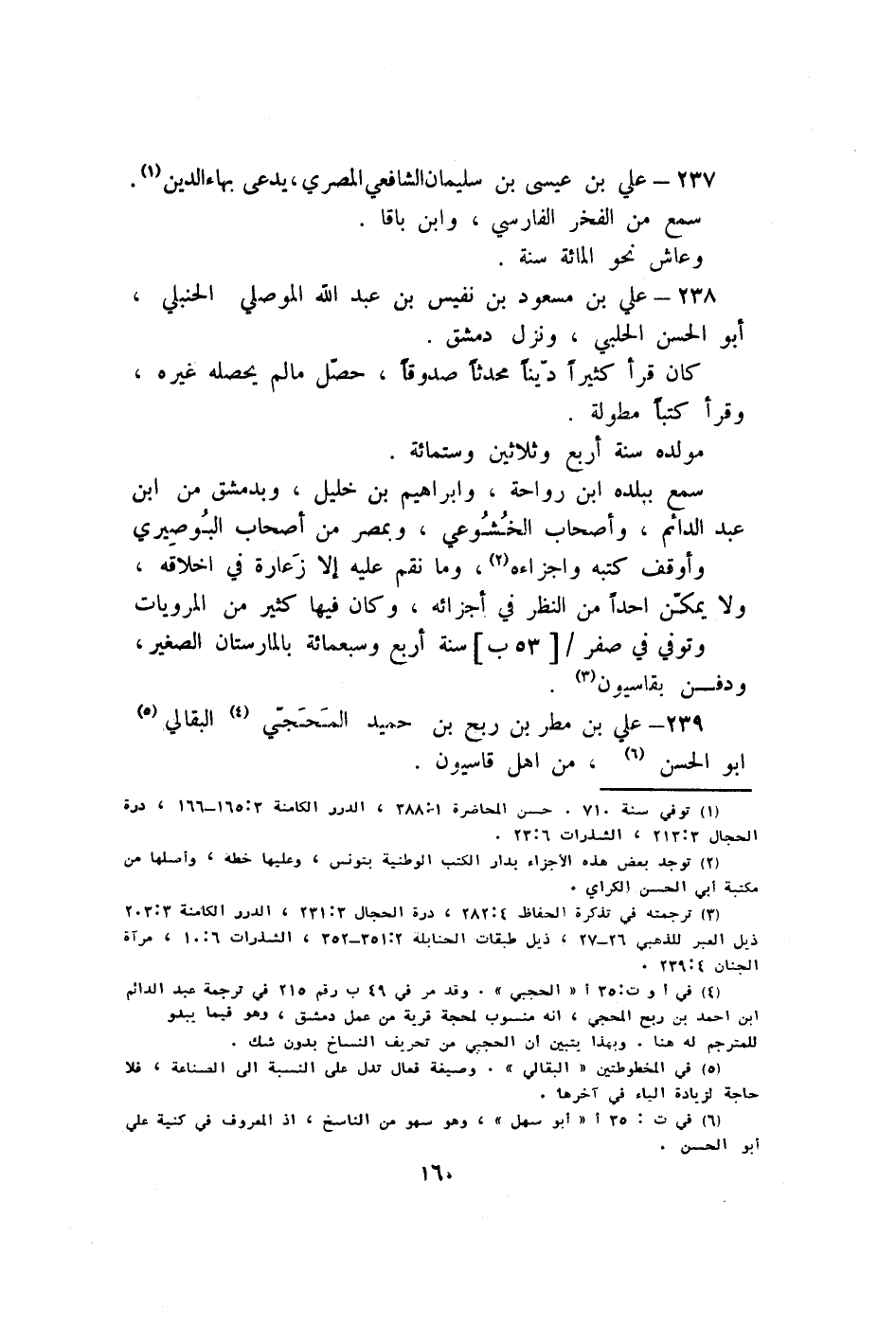 237 - عَليّ بن عِيسَى بن سُلَيْمَان الشَّافِعِي الْمصْرِيّ يدعى بهاء الدّين سمع من الْفَخر الْفَارِسِي وَابْن باقا وعاش نَحْو الْمِائَة سنة