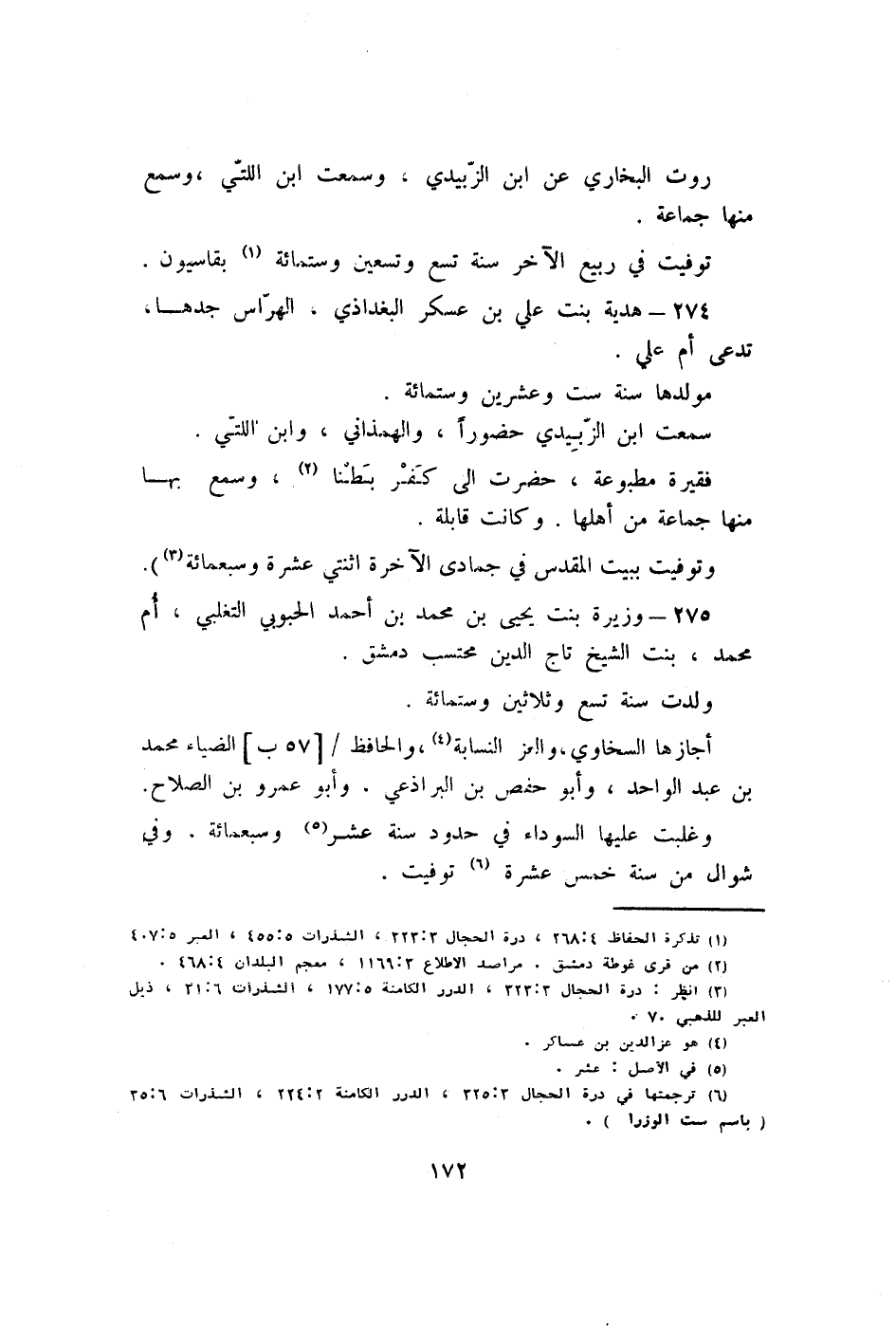 275 - وزيرة بنت يحيى بن مُحَمَّد بن أَحْمد الحبوني التغلبي أم مُحَمَّد بنت الشَّيْخ تَاج الدّين محتسب دمشق