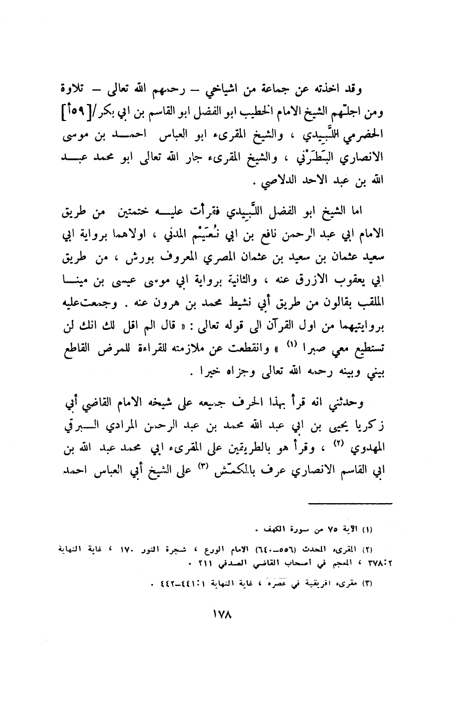 وَقد أَخَذته عَن جمَاعَة من أشياخي رَحِمهم الله تَعَالَى تِلَاوَة وَمن أَجلهم الشَّيْخ الإِمَام الْخَطِيب أَبُو الْفضل أَبُو الْقَاسِم بن ابي بكر الْحَضْرَمِيّ اللبيدي وَالشَّيْخ الْمُقْرِئ أَبُو الْعَبَّاس أَحْمد بن مُوسَى الْأنْصَارِيّ البطرني وَالشَّيْخ الْمُقْرِئ جَار الله تَعَالَى أَبُو مُحَمَّد عبد الله بن عبد الْأَحَد الدلاصي