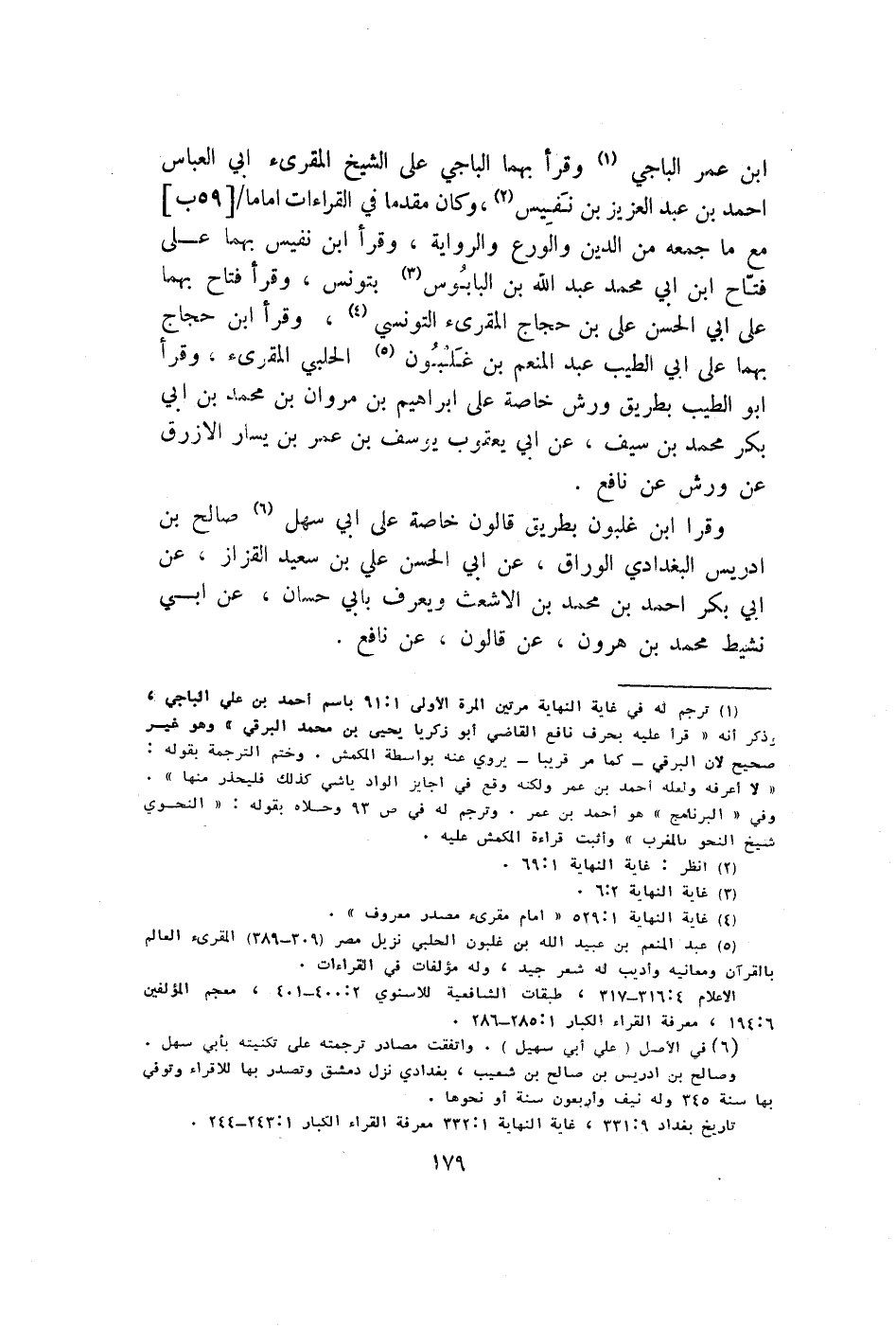 ابْن عمر الْبَاجِيّ وقرا بهما الْبَاجِيّ على الشَّيْخ الْمُقْرِئ ابي الْعَبَّاس أَحْمد بن عبد الْعَزِيز بن نَفِيس وَكَانَ مقدما فِي الْقرَاءَات إِمَامًا مَعَ مَا جمعه من الدّين والورع وَالرِّوَايَة وقرا ابْن نَفِيس بهما على فتاح ابْن ابي مُحَمَّد عبد الله بن البابوس بتونس وَقَرَأَ فتاح بهما على ابي الْحسن على بن حجاج الْمُقْرِئ التّونسِيّ وقرا ابْن حجاج بهما على ابي الطّيب عبد الْمُنعم بن غلبون الْحلَبِي الْمُقْرِئ وَقَرَأَ أَبُو الطّيب بطرِيق ورش خَاصَّة على إِبْرَاهِيم بن مَرْوَان بن مُحَمَّد بن ابي بكر مُحَمَّد بن سيف عَن ابي يَعْقُوب يُوسُف بن عمر بن يسَار الْأَزْرَق عَن ورش عَن نَافِع