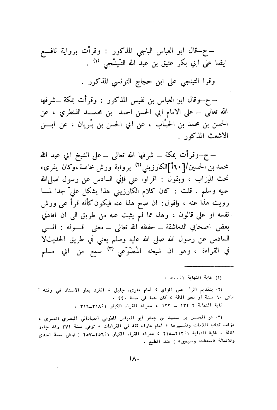 ح وقرأت بِمَكَّة شرفها الله تَعَالَى على الشَّيْخ ابي عبد الله مُحَمَّد بن الْحُسَيْن الكارزيني بِرِوَايَة ورش خَاصَّة وَكَانَ يقرئ تَحت الْمِيزَاب وَيَقُول اقراوا على فَإِنِّي السَّادِس عَن رَسُول صلى الله عَلَيْهِ وَسلم قلت كَانَ كَلَام الكارزيني هَذَا يشكل عَليّ جدا لما رويت هَذَا عَنهُ وَأَقُول إِن صَحَّ هَذَا عَنهُ فَيكون كَأَنَّهُ قَرَأَ على ورش نَفسه أَو على قالون وَهَذَا مِمَّا لم يثبت عَنهُ من طَرِيق إِلَى أَن أفادني بعض أَصْحَابِي الدماشقة حفظه الله تَعَالَى معنى قَوْله إِنِّي السَّادِس عَن رَسُول الله صلى الله عَلَيْهِ وَسلم يَعْنِي فِي طَرِيق الحَدِيث لَا فِي الْقِرَاءَة وَهُوَ إِن شَيْخه المطوعي سمع من ابي مُسلم
