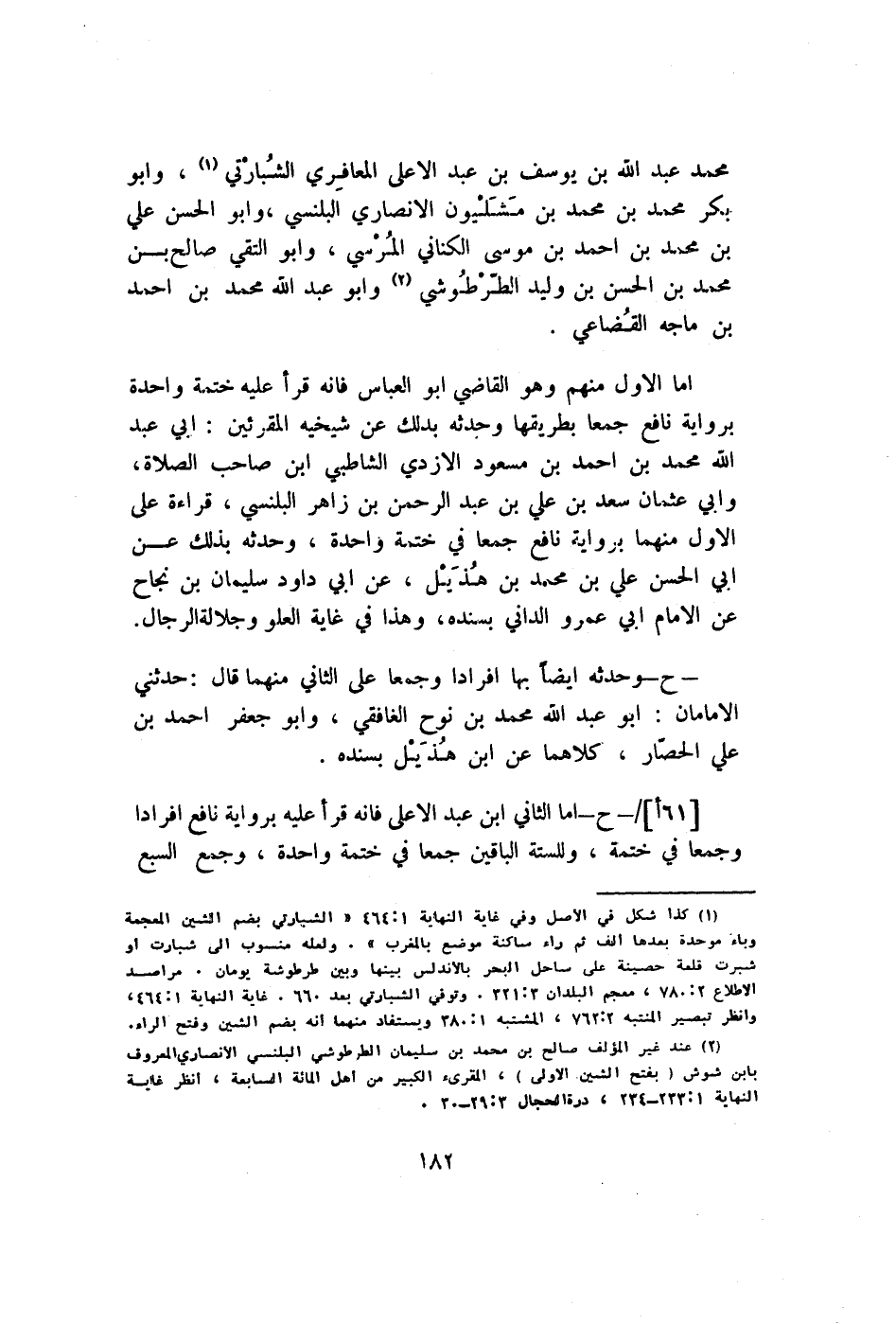 أما الأول مِنْهُم وَهُوَ القَاضِي أَبُو الْعَبَّاس فَإِنَّهُ قَرَأَ عَلَيْهِ ختمة وَاحِدَة بِرِوَايَة نَافِع جمعا بطريقها وحدثه بذلك عَن شيخيه المقرئين ابي عبد الله مُحَمَّد بن أَحْمد بن مَسْعُود الْأَزْدِيّ الشاطبي أبن صَاحب الصَّلَاة وابي عُثْمَان سعد بن عَليّ بن عبد الرَّحْمَن بن زَاهِر البلنسي قِرَاءَة على الأول مِنْهُمَا بِرِوَايَة نَافِع جمعا فِي ختمة وَاحِدَة وحدثه بذلك عَن ابي الْحسن عَليّ بن مُحَمَّد بن هُذَيْل عَن ابي دَاوُد سُلَيْمَان بن نجاح عَن الإِمَام ابي عَمْرو الداني بِسَنَدِهِ وَهَذَا فِي غَايَة الْعُلُوّ وجلالة الرِّجَال