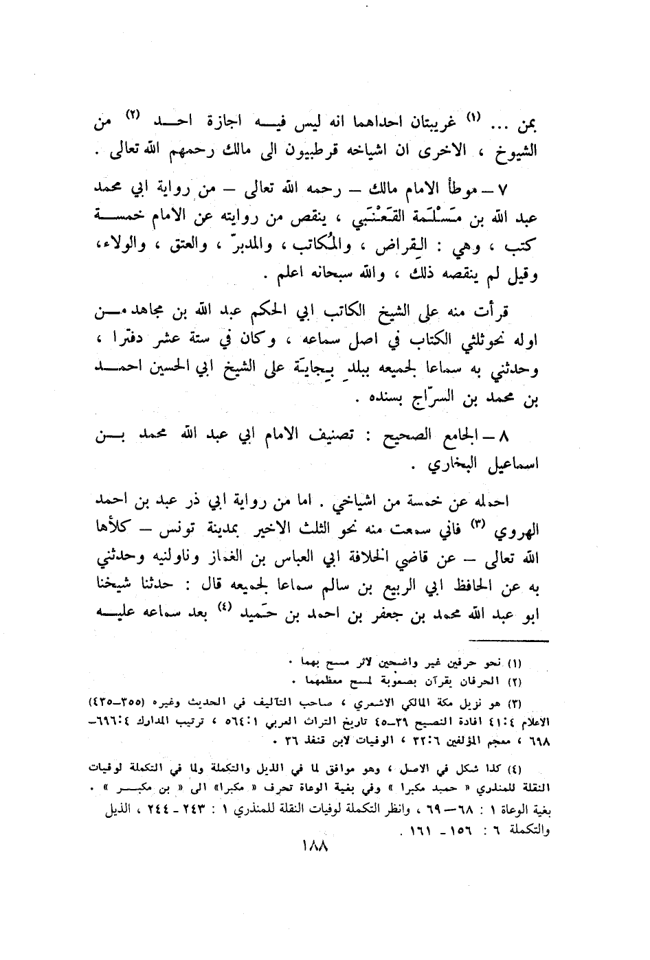 بِمن. . غريبتان أحداهما أَنه لَيْسَ فِيهِ إجَازَة أحد من الشُّيُوخ الْأُخْرَى أَن أشياخه قرطبيون إِلَى مَالك رَحِمهم الله تَعَالَى