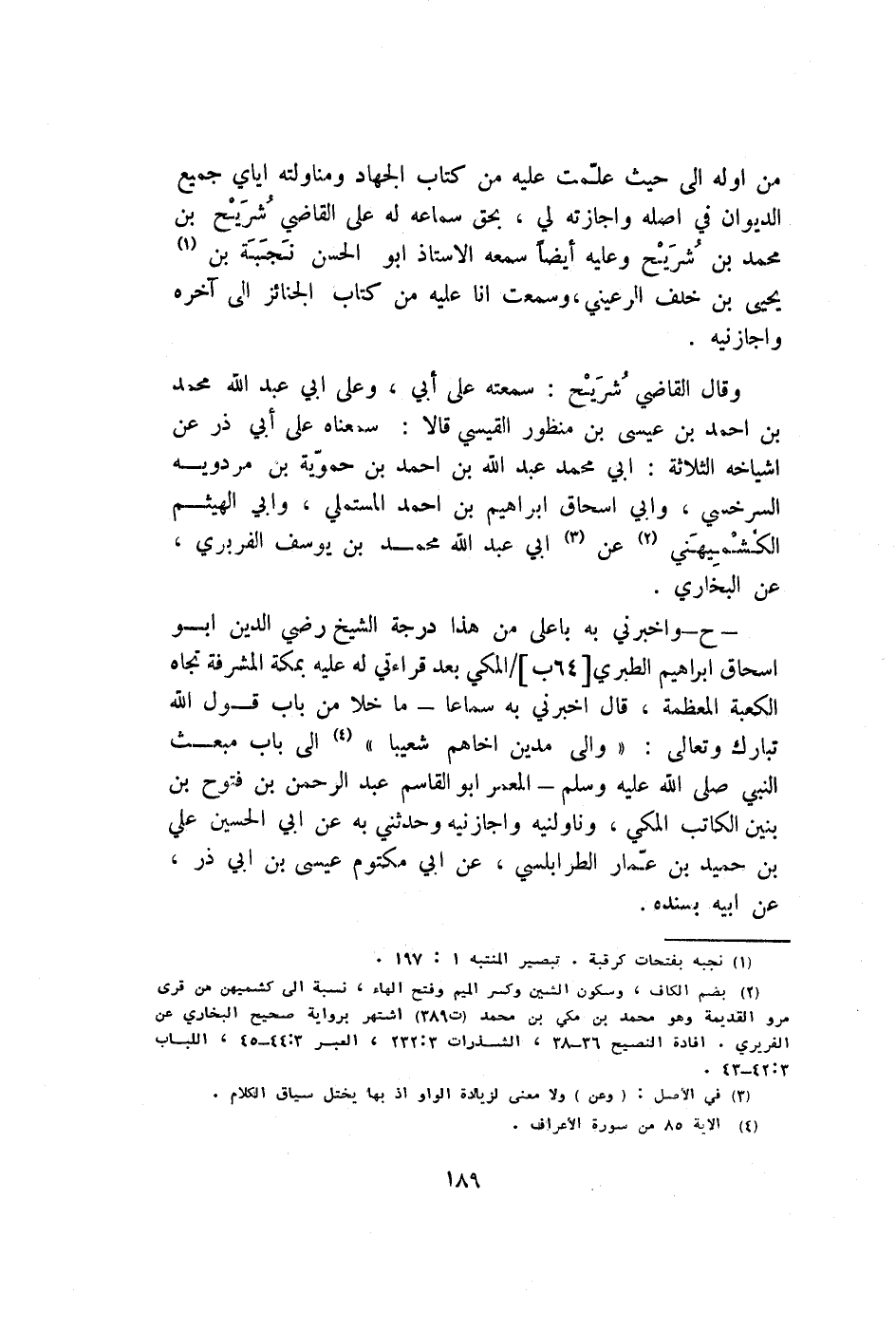 وَقَالَ القَاضِي شُرَيْح سمعته على ابي وعَلى ابي عبد الله مُحَمَّد بن أَحْمد بن عِيسَى بن مَنْظُور الْقَيْسِي قَالَا سمعناه على ابي ذَر عَن أشياخه الثَّلَاثَة ابي مُحَمَّد عبد الله بن أَحْمد بن حموية بن مرْدَوَيْه السَّرخسِيّ وابي إِسْحَاق إِبْرَاهِيم بن أَحْمد الْمُسْتَمْلِي وابي الْهَيْثَم الْكشميهني عَن ابي عبد الله مُحَمَّد بن يُوسُف الْفربرِي عَن البُخَارِيّ