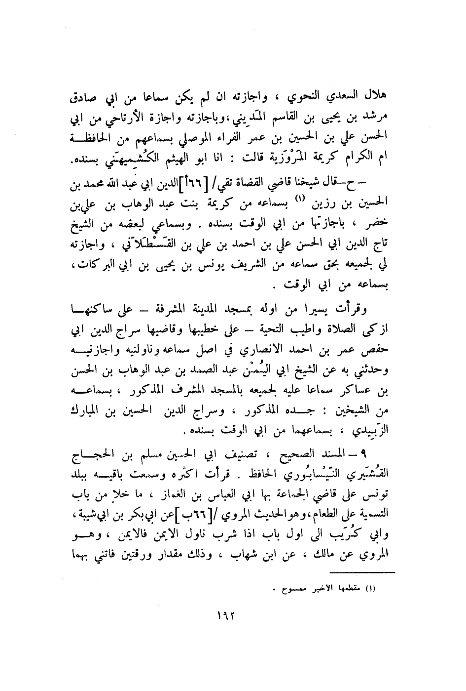 9 - الْمسند الصَّحِيح تصنيف ابي الْحُسَيْن مُسلم بن الْحجَّاج الْقشيرِي النَّيْسَابُورِي الْحَافِظ قَرَأت أَكْثَره وَسمعت بَاقِيه بِبَلَد تونس على قَاضِي الْجَمَاعَة بهَا أبي الْعَبَّاس بن الغماز مَا خلا من بَاب التَّسْمِيَة على الطَّعَام وَهُوَ الحَدِيث الْمَرْوِيّ عَن ابي بكر بن ابي شيبَة وابي كريب إِلَى أول بَاب إِذا شرب ناول الْأَيْمن فالأيمن وَهُوَ الْمَرْوِيّ عَن مَالك عَن ابْن شهَاب وَذَلِكَ مِقْدَار ورقتين فَاتَنِي بهما