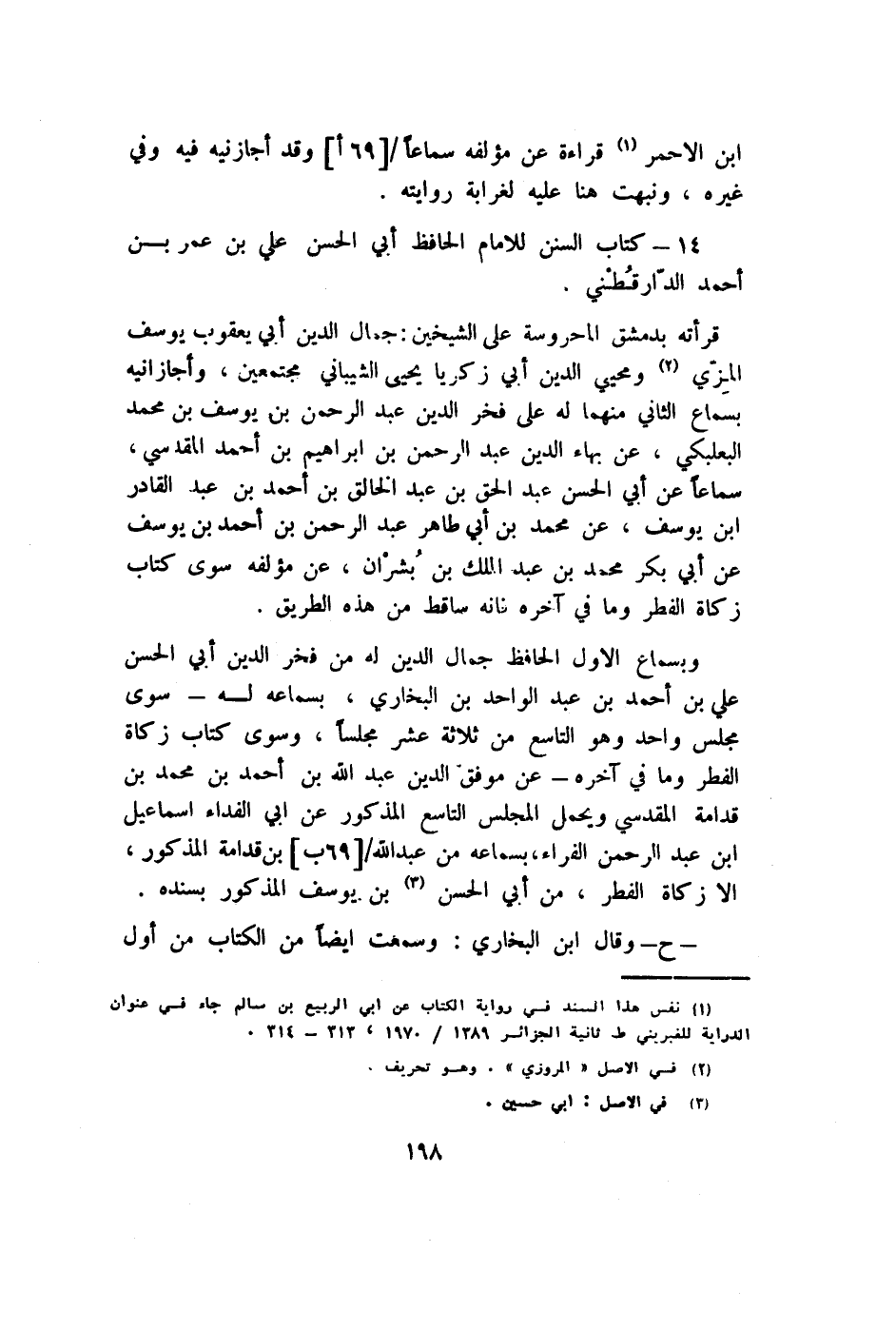 قرأته بِدِمَشْق المحروسة على الشَّيْخَيْنِ جمال الدّين ابي يَعْقُوب يُوسُف الْمزي ومحيي الدّين ابي زَكَرِيَّا يحيى الشَّيْبَانِيّ مُجْتَمعين وأجازانيه بِسَمَاع الثَّانِي مِنْهُمَا لَهُ على فَخر الدّين عبد الرَّحْمَن بن يُوسُف بن مُحَمَّد البعلبكي عَن بهاء الدّين عبد الرَّحْمَن بن إِبْرَاهِيم بن أَحْمد الْمَقْدِسِي سَمَاعا عَن ابي الْحسن عبد الْحق بن عبد الْخَالِق بن أَحْمد بن عبد الْقَادِر ابْن يُوسُف عَن مُحَمَّد بن ابي طَاهِر عبد الرَّحْمَن بن أَحْمد بن يُوسُف عَن ابي بكر مُحَمَّد بن عبد الْملك بن بَشرَان عَن مُؤَلفه سوى كتاب زَكَاة الْفطر وَمَا فِي آخِره فَإِنَّهُ سَاقِط من هَذِه الطَّرِيق