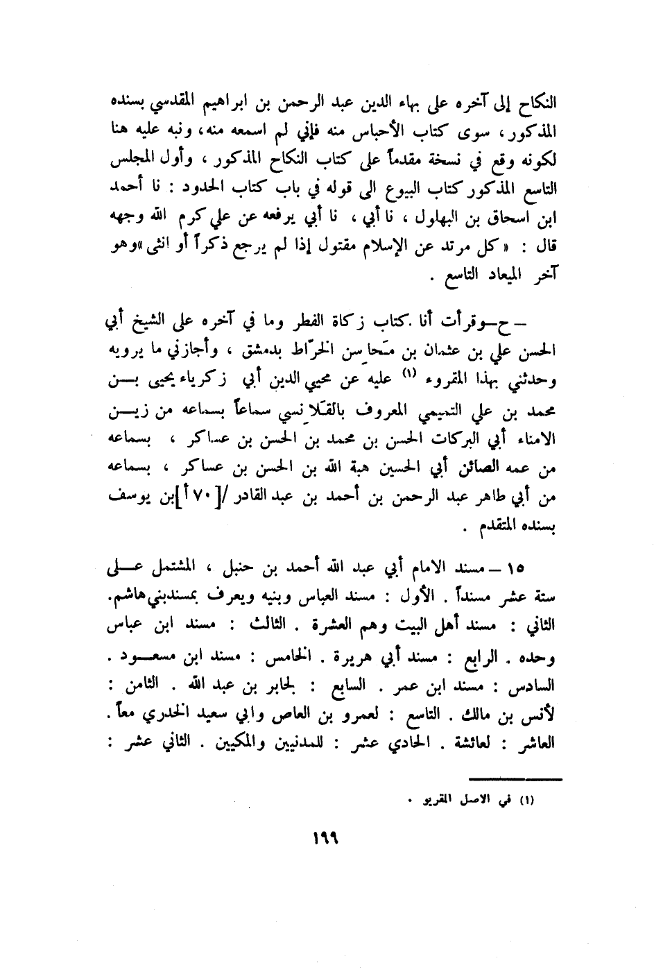 النِّكَاح إِلَى آخِره على بهاء الدّين عبد الرَّحْمَن بن إِبْرَاهِيم الْمَقْدِسِي بِسَنَدِهِ الْمَذْكُور سوى كتاب الأحباس مِنْهُ فَإِنِّي لم اسْمَعْهُ مِنْهُ وَنبهَ عَلَيْهِ هُنَا لكَونه وَقع فِي نُسْخَة مقدما على كتاب النِّكَاح الْمَذْكُور وَأول الْمجْلس التَّاسِع الْمَذْكُور كتاب الْبيُوع إِلَى قَوْله فِي بَاب كتاب الْحُدُود نَا أَحْمد ابْن إِسْحَاق بن البهلول نَا ابي نَا ابي يرفعهُ عَن عَليّ كرم الله وَجهه قَالَ كل مُرْتَد عَن الْإِسْلَام مقتول إِذا لم يرجع ذكرا أَو أثنى وَهُوَ آخر الميعاد التَّاسِع