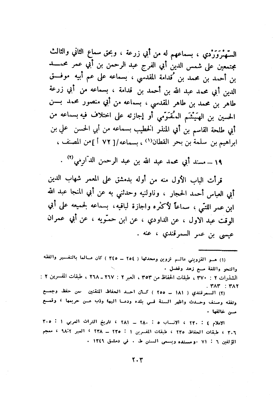 السهروردي بسماعهم لَهُ من ابي زرْعَة وبحق سَماع الثَّانِي وَالثَّالِث مُجْتَمعين على شمس الدّين ابي الْفرج عبد الرَّحْمَن بن ابي عمر مُحَمَّد بن أَحْمد بن مُحَمَّد بن قدامَة الْمَقْدِسِي بِسَمَاعِهِ على عَم ابيه موفق الدّين ابي مُحَمَّد عبد الله بن أَحْمد بن قدامَة بِسَمَاعِهِ من ابي زرْعَة طَاهِر بن مُحَمَّد بن طَاهِر الْمَقْدِسِي بِسَمَاعِهِ من ابي مَنْصُور مُحَمَّد بن الْحُسَيْن بن الْهَيْثَم المقومي أَو إِجَازَته على اخْتِلَاف فِيهِ بِسَمَاعِهِ من ابي طَلْحَة الْقَاسِم بن ابي الْمُنْذر الْخَطِيب بِسَمَاعِهِ من ابي عَليّ بن إِبْرَاهِيم بن سَلمَة بن بَحر الْقطَّان بِسَمَاعِهِ من المُصَنّف