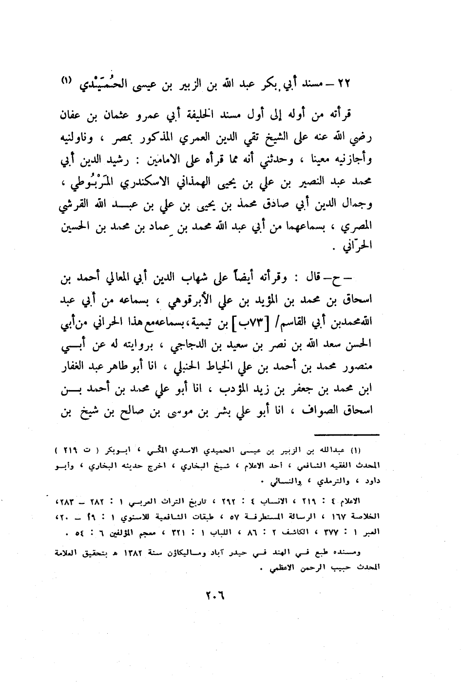 قرأته من أَوله إِلَى أول مُسْند الْخَلِيفَة ابي عَمْرو عُثْمَان بن عَفَّان رَضِي الله عَنهُ على الشَّيْخ تَقِيّ الدّين الْعمريّ الْمَذْكُور بِمصْر وناولنيه وأجازنيه معينا وحَدثني أَنه مِمَّا قَرَأَهُ على الأمامين رشيد الدّين ابي مُحَمَّد عبد النصير بن عَليّ بن يحيى الهمذاني الإسكندري المربوطي وجمال الدّين ابي صَادِق مُحَمَّد بن يحيى بن عَليّ بن عبد الله الْقرشِي الْمصْرِيّ بسماعهما من ابي عبد الله مُحَمَّد بن عماد بن مُحَمَّد بن الْحُسَيْن الْحَرَّانِي