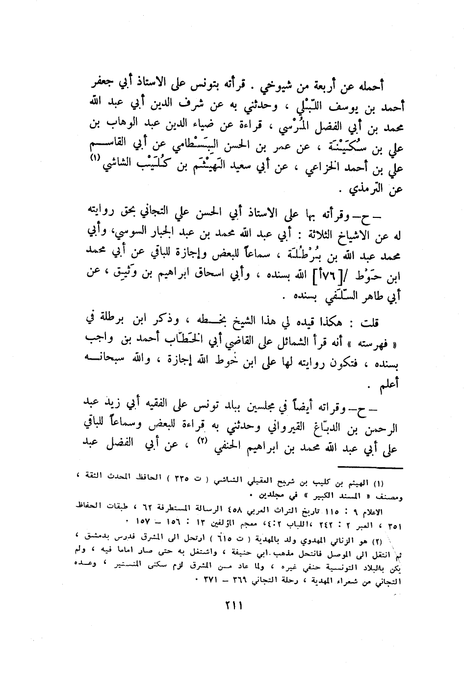 أحملهُ عَن اربعة من شيوخي قرأته بتونس على الاستاذ ابي جَعْفَر أَحْمد بن يُوسُف اللبلي وحَدثني بِهِ عَن شرف الدّين ابي عبد الله مُحَمَّد بن ابي الْفضل المرسي قِرَاءَة عَن ضِيَاء الدّين عبد الْوَهَّاب بن عَليّ بن سكينَة عَن عمر بن الْحسن البسطامي عَن ابي الْقَاسِم عَليّ بن احْمَد الْخُزَاعِيّ عَن ابي سعيد الْهَيْثَم بن كُلَيْب الشَّاشِي عَن التِّرْمِذِيّ