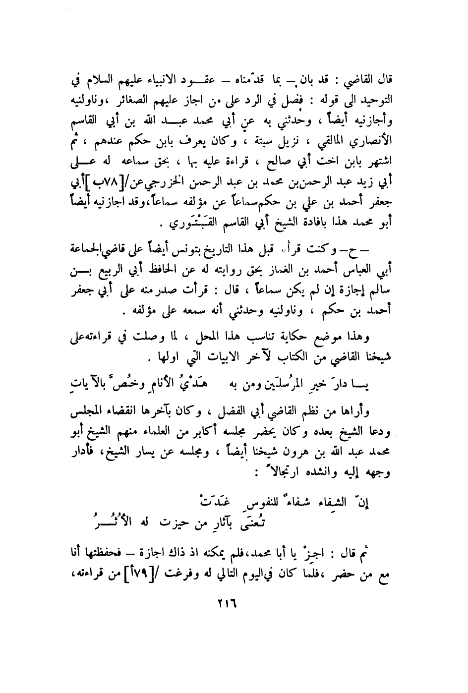 قَالَ القَاضِي قد بَان بِمَا قدمْنَاهُ عُقُود الْأَنْبِيَاء عَلَيْهِم السَّلَام فِي التَّوْحِيد إِلَى قَوْله فصل فِي الرَّد على من أجَاز عَلَيْهِم الصَّغَائِر وناولنيه وأجازنيه أَيْضا وحَدثني بِهِ عَن ابي مُحَمَّد عبد الله بن ابي الْقَاسِم الْأنْصَارِيّ المالقي نزيل سبتة وَكَانَ يعرف بِابْن حكم عِنْدهم ثمَّ اشْتهر بِابْن أُخْت ابي صَالح قِرَاءَة عَلَيْهِ بهَا بِحَق سَمَاعه لَهُ على ابي زيد عبد الرَّحْمَن بن مُحَمَّد بن عبد الرَّحْمَن الخزرجي عَن ابي جَعْفَر أَحْمد بن عَليّ بن حكم سَمَاعا عَن مُؤَلفه سَمَاعا وَقد أجازنيه أَيْضا أَبُو مُحَمَّد هَذَا بإفادة الشَّيْخ ابي الْقَاسِم القبتوري