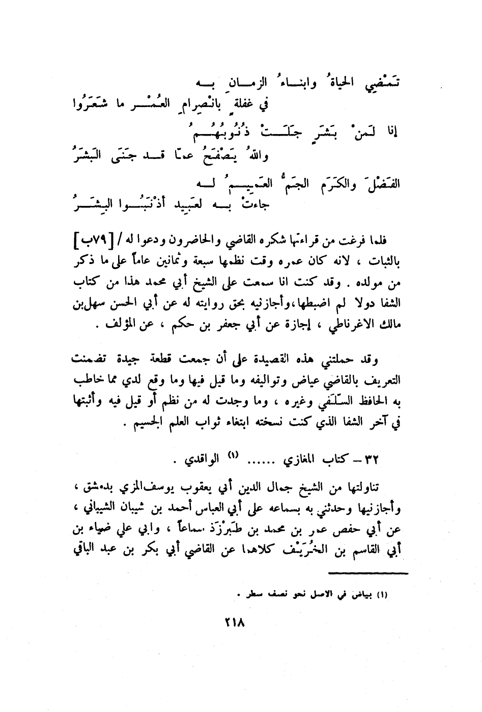 وَقد حَملتنِي هَذِه القصيدة على أَن جمعت قِطْعَة جَيِّدَة تَضَمَّنت التَّعْرِيف بِالْقَاضِي عِيَاض وتواليفه وَمَا قيل فِيهَا وَمَا وَقع لدي مِمَّا خَاطب بِهِ الْحَافِظ السلَفِي وَغَيره وَمَا وجدت لَهُ من نظم أَو قيل فِيهِ وأثبتها فِي آخر الشفا الَّذِي كنت نسخته ابْتِغَاء ثَوَاب الْعلم الجسيم