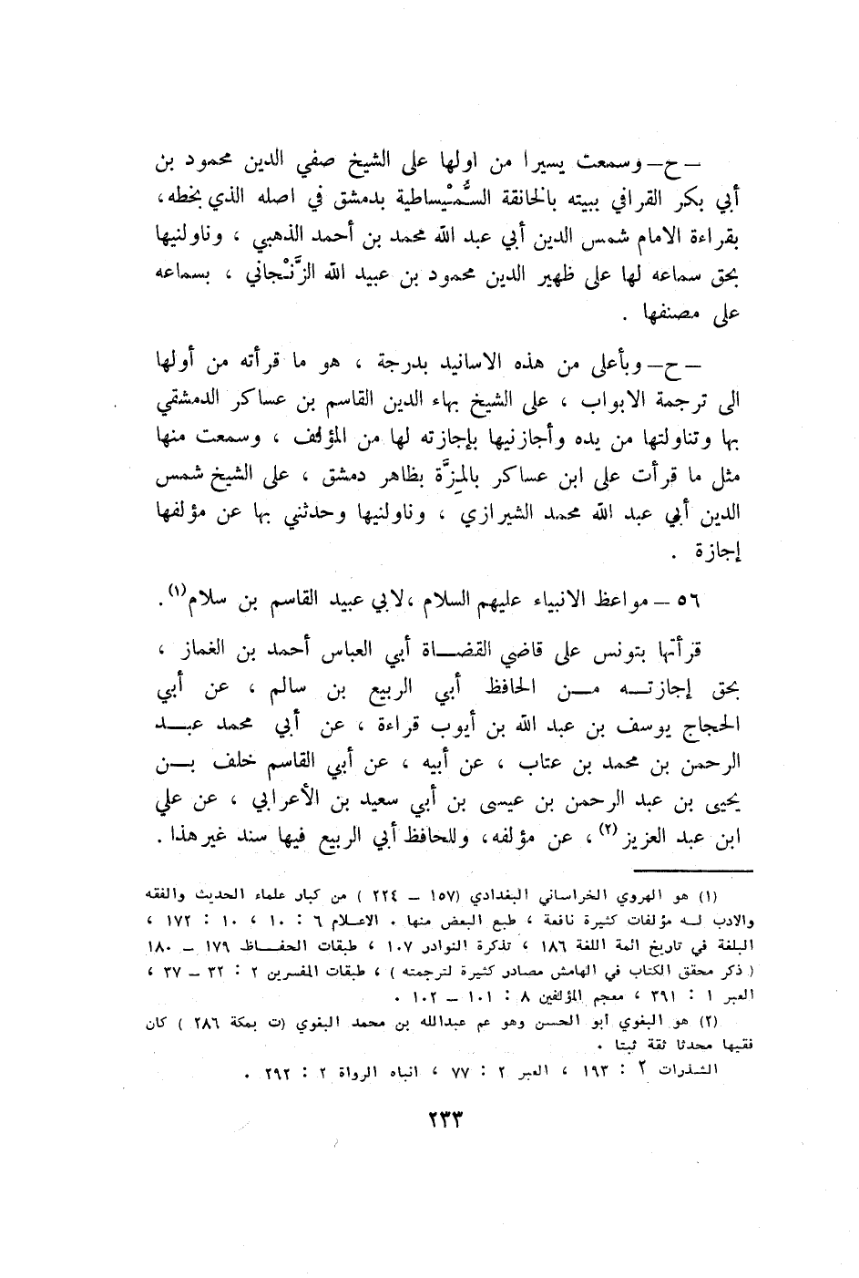 ح وَسمعت يَسِيرا من أَولهَا على الشَّيْخ صفي الدّين مَحْمُود بن ابي بكر الْقَرَافِيّ ببيته بالخانقة السميساطية بِدِمَشْق فِي أَصله الَّذِي بِخَطِّهِ بِقِرَاءَة الإِمَام شمس الدّين ابي عبد الله مُحَمَّد بن أَحْمد الذَّهَبِيّ وناولنيها بِحَق سَمَاعه لَهَا على ظهير الدّين مَحْمُود بن عبيد الله الزنجاني بِسَمَاعِهِ على مصنفها