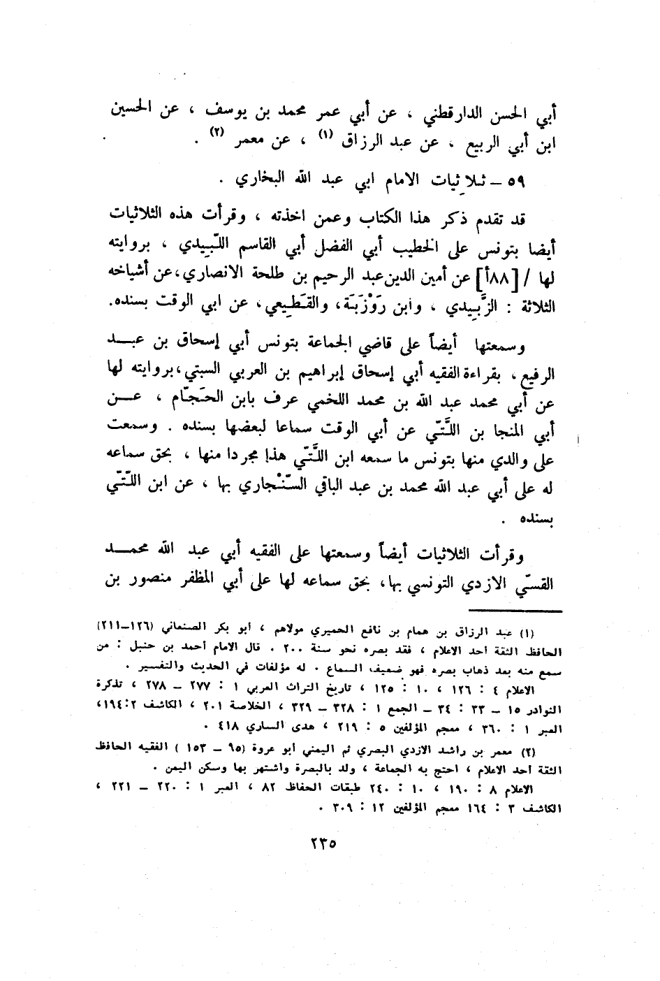 قد تقدم ذكر هَذَا الْكتاب وَعَمن أَخَذته وقرأت هَذِه الثلاثيات أَيْضا بتونس على الْخَطِيب ابي الْفضل ابي الْقَاسِم اللبيدي بروايته لَهَا عَن أَمِين الدّين عبد الرَّحِيم بن طَلْحَة الْأنْصَارِيّ عَن أشياخه الثَّلَاثَة الزبيدِيّ وَابْن روزبة والقطيعي عَن ابي الْوَقْت بِسَنَدِهِ
