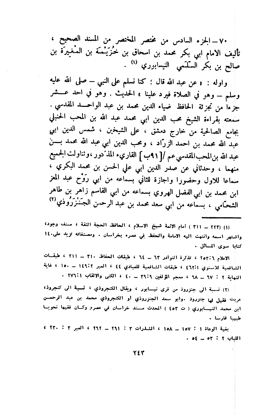 70 - الْجُزْء السَّادِس من مُخْتَصر الْمُخْتَصر من الْمسند الصَّحِيح تأليف الإِمَام ابي بكر مُحَمَّد بن إِسْحَاق بن خُزَيْمَة بن الْمُغيرَة بن صَالح بن بكر السّلمِيّ النَّيْسَابُورِي