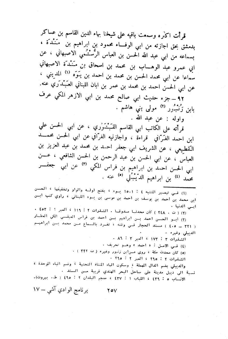 قَرَأت أَكْثَره وَسمعت بَاقِيه على شَيخنَا بهاء الدّين الْقَاسِم بن عَسَاكِر بِدِمَشْق بِحَق إِجَازَته من ابي الْوَفَاء مَحْمُود بن إِبْرَاهِيم بن مندة بِسَمَاعِهِ من ابي عبد الله الْحسن بن الْعَبَّاس الرستمي الْأَصْبَهَانِيّ عَن ابي عَمْرو عبد الْوَهَّاب بن مُحَمَّد بن إِسْحَاق بن مندة الْأَصْبَهَانِيّ سَمَاعا عَن ابي مُحَمَّد الْحسن بن مُحَمَّد بن احْمَد بن يوه الْمَدِينِيّ عَن ابي الْحسن احْمَد بن مُحَمَّد بن عمر بن ابان اللبناني الْعَبدَرِي عَنهُ