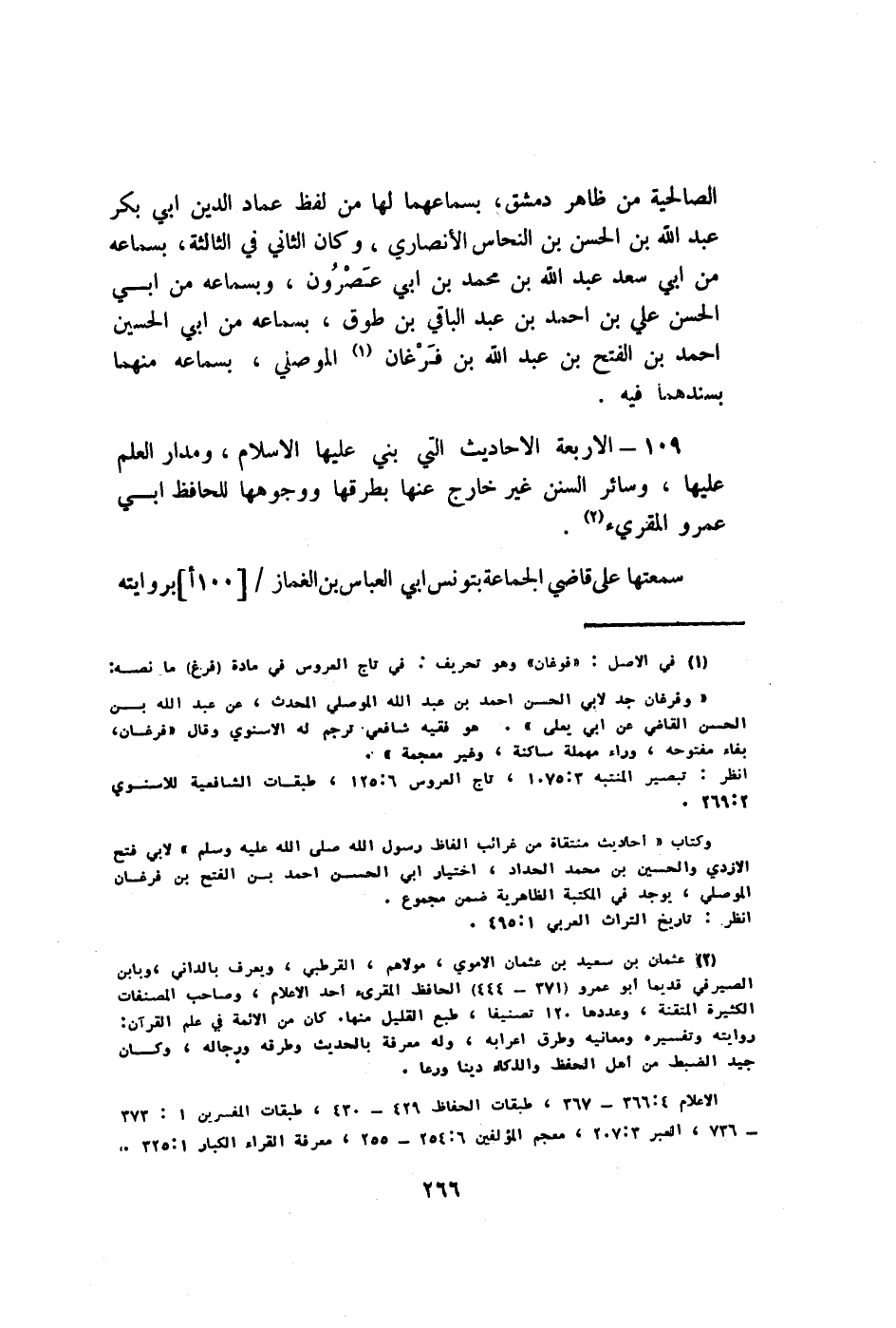 الصالحية من ظَاهر دمشق بسماعهما لَهَا من لفظ عماد الدّين ابي بكر عبد الله بن الْحسن بن النّحاس النصاري وَكَانَ الثَّانِي فِي الثَّالِثَة بِسَمَاعِهِ من ابي سعد عبد الله بن مُحَمَّد بن ابي عصرون وبسماعه من ابي الْحسن عَليّ بن أَحْمد بن عبد الْبَاقِي بن طوق بِسَمَاعِهِ من ابي الْحُسَيْن أَحْمد بن الْفَتْح بن عبد الله بن فرغان الْموصِلِي بِسَمَاعِهِ مِنْهُمَا بسندهما فِيهِ