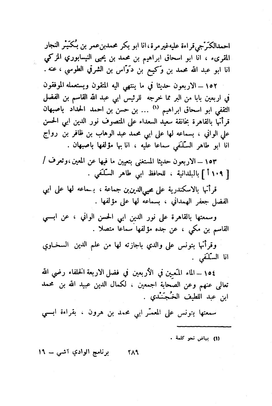 152 - الْأَرْبَعُونَ حَدِيثا فِي مَا يَنْتَهِي إِلَيْهِ المتقون ويستعمله الموفقون فِي أَرْبَعِينَ بَابا من الْبر مِمَّا خرجه للرئيس ابي عبد الله الْقَاسِم بن الْفضل الثَّقَفِيّ أَبُو إِسْحَاق إِبْرَاهِيم. . بن حسن بن أَحْمد الْحداد بأصبهان قرأتها بِالْقَاهِرَةِ بخانقة سعيد السُّعَدَاء على المتصوف نور الدّين ابي الْحسن على الواني بِسَمَاعِهِ لَهَا على ابي مُحَمَّد عبد الْوَهَّاب بن ظافر بن رواج انا أَبُو طَاهِر السلَفِي سَمَاعا عَلَيْهِ أَنا بهَا مؤلفها باصبهان